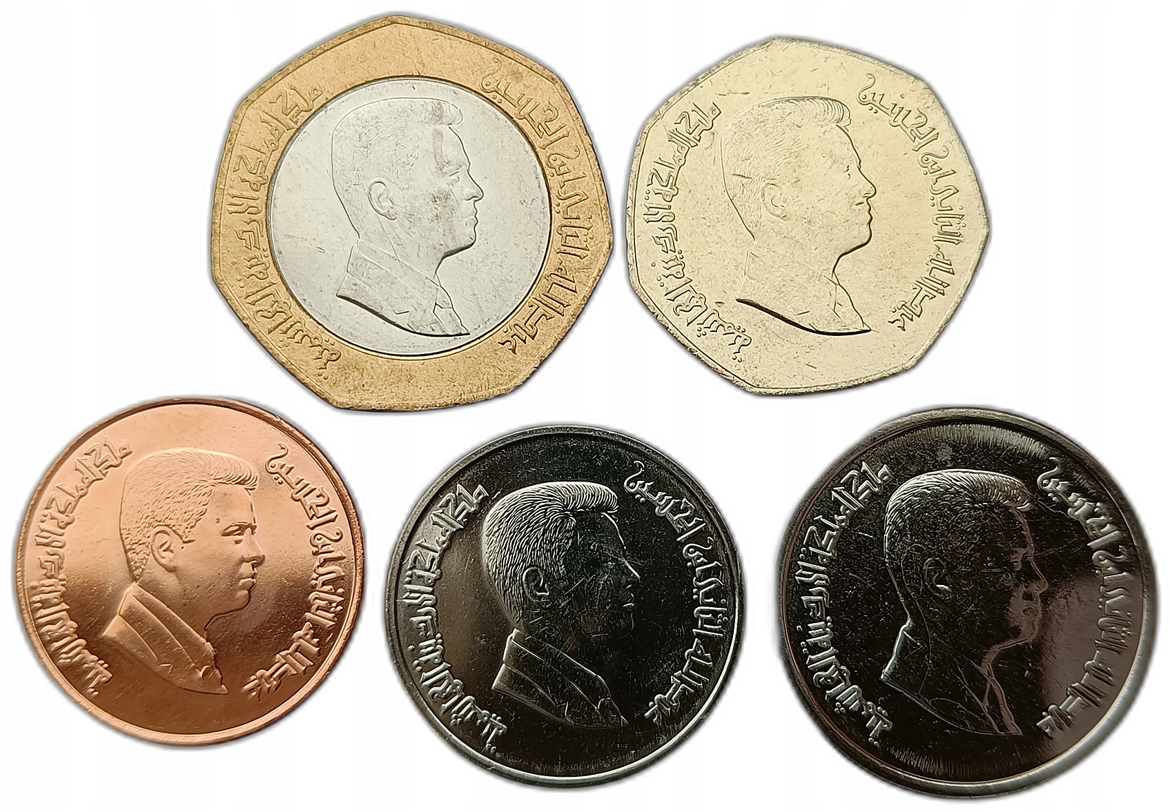 Zestaw 5 monet Jordanii o nominałach 1 qirsh, 5 qirsh, 10 qirsh, 25 qirsh oraz 1/2 dinara, wydanych w latach 2008-2012. Monety przedstawiają różne symbole związane z historią i kulturą Jordanii, w tym wizerunki władców i zabytków narodowych. Monety zostały wybite z metali nieszlachetnych i są w stanie menniczym, bez śladów użytkowania.