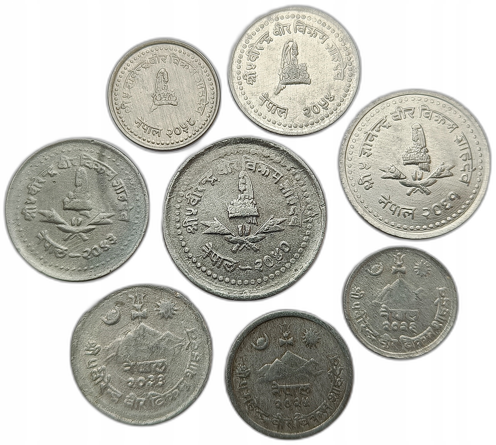 Zestaw 8 monet Nepalu o nominałach 1 - 50 paisa wykonanych z aluminium. Monety pochodzą z różnych roczników.