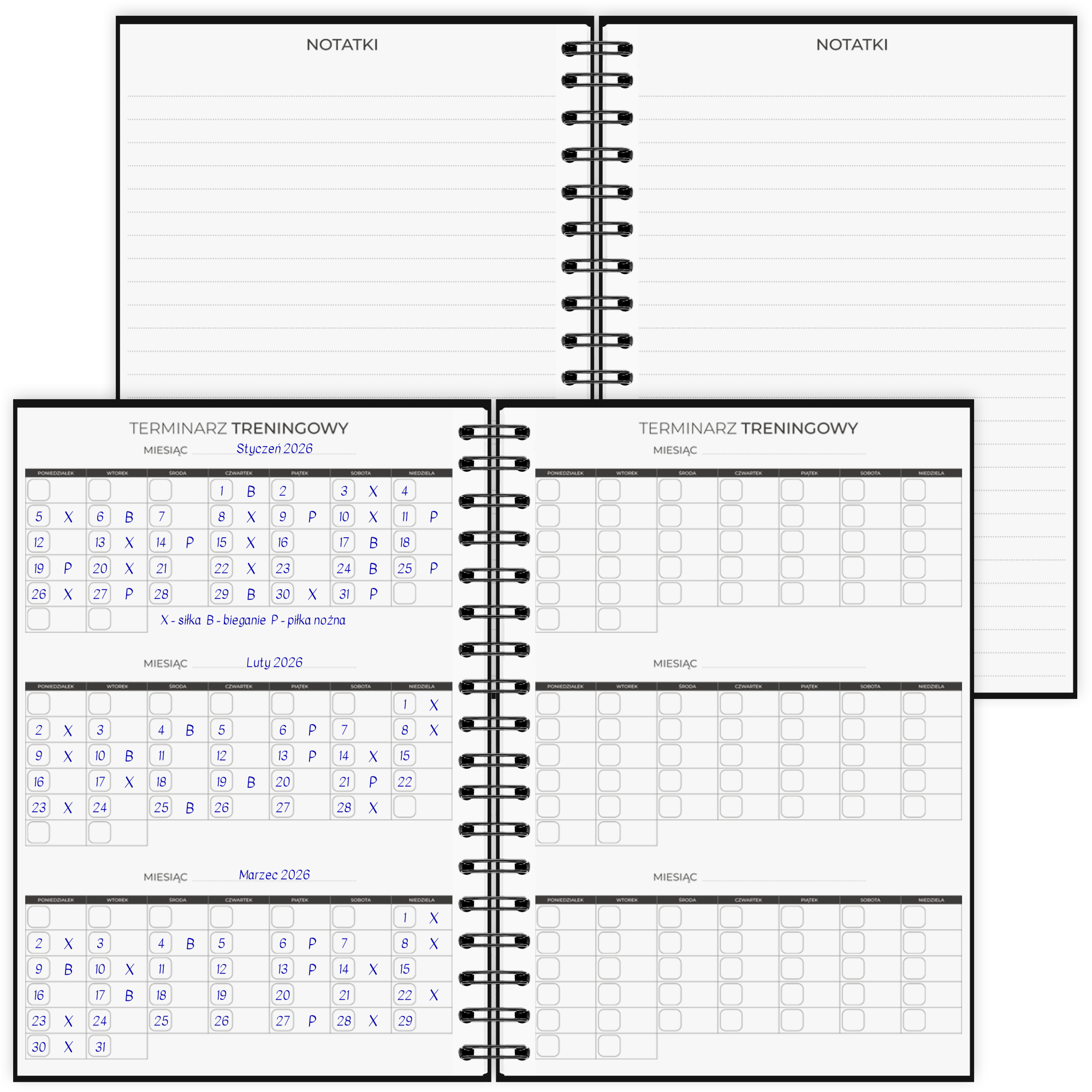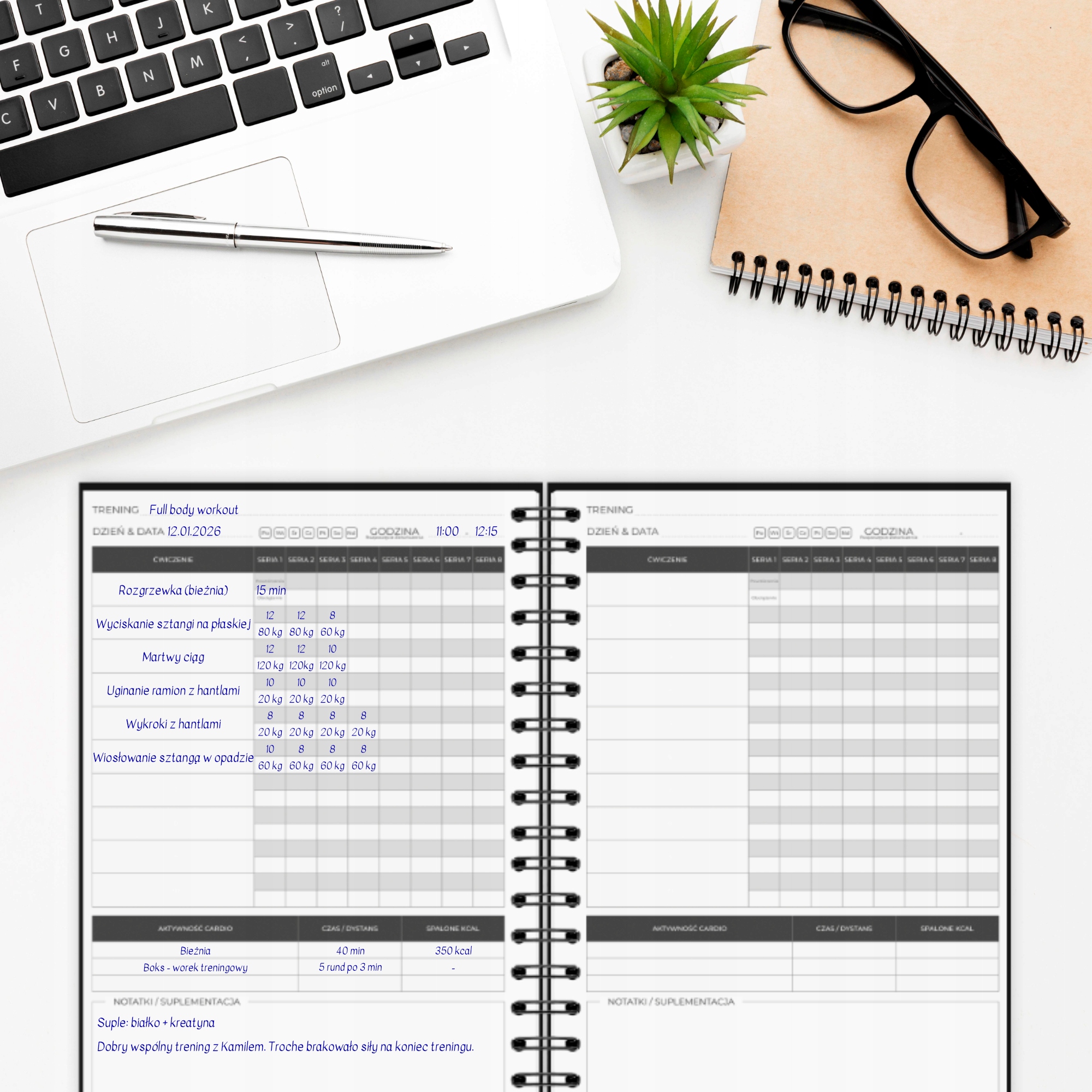 Planer treningowy pomoże zorganizować wszystkie treningi w jednym miejscu, we wnętrzu znajdziesz: