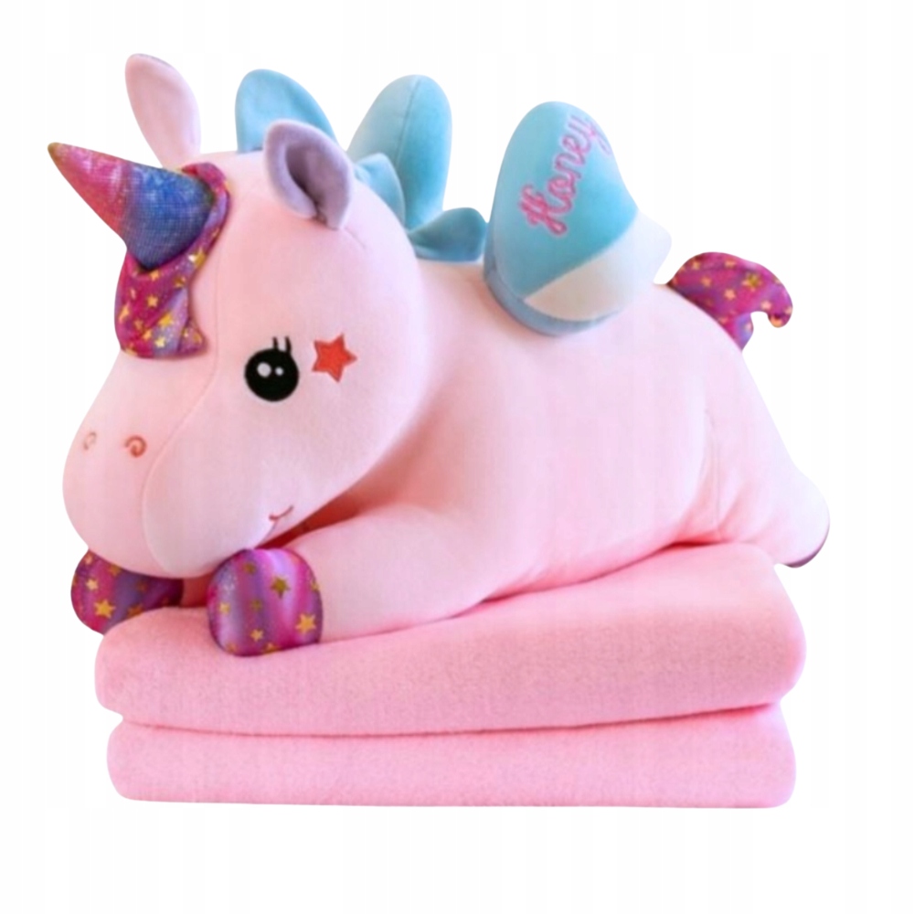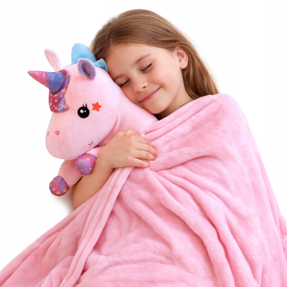 Rodzice i dzieci pokochają tego uroczego pluszowego jednorożca! To nie tylko słodka maskotka, ale także praktyczna poduszka i ciepły kocyk – wszystko w jednym! Miękki, puszysty i bezpieczny dla najmłodszych, idealnie sprawdzi się jako towarzysz snu, podróży czy odpoczynku.