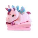 Kocyk sprytnie ukryty w brzuszku jednorożca sprawia, że maskotka wygląda jak uroczy pluszak, a jednocześnie jest niezwykle praktyczna.