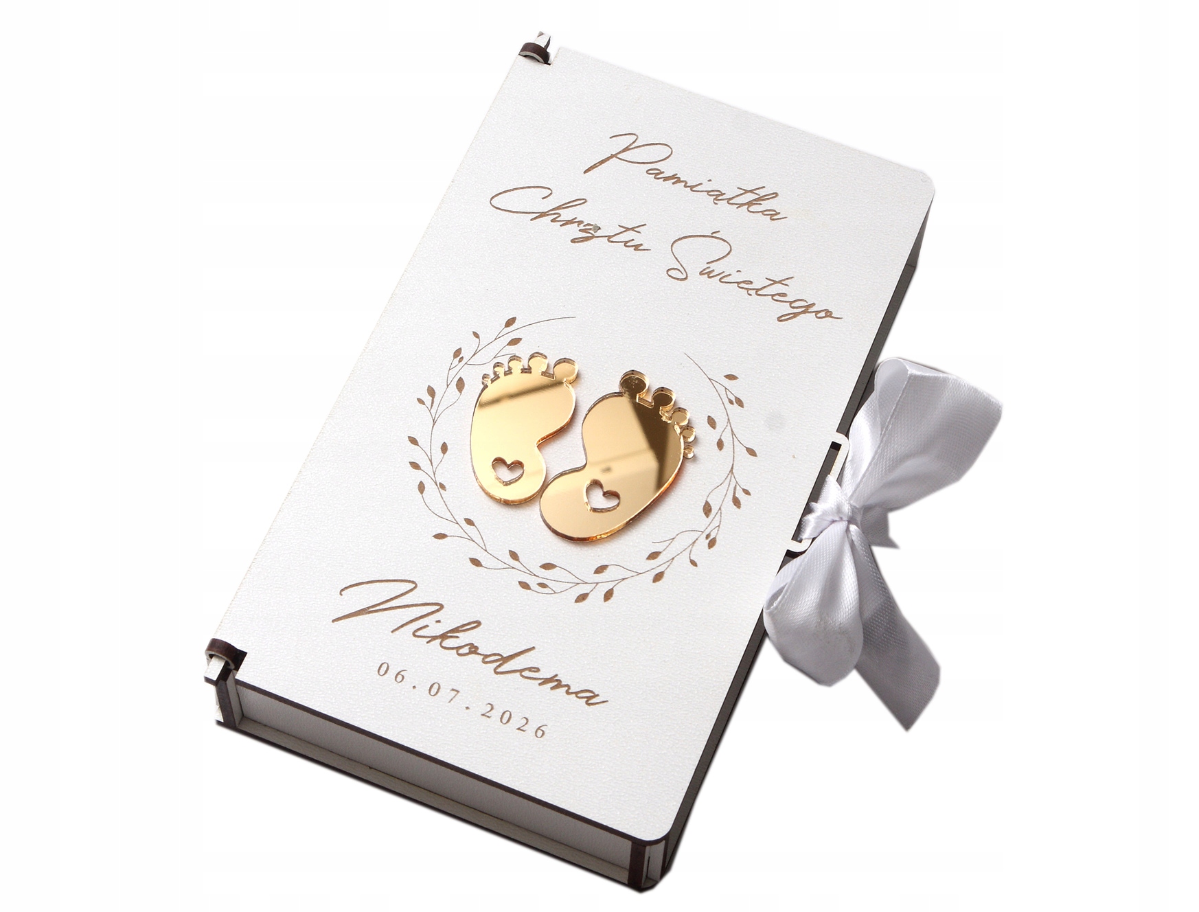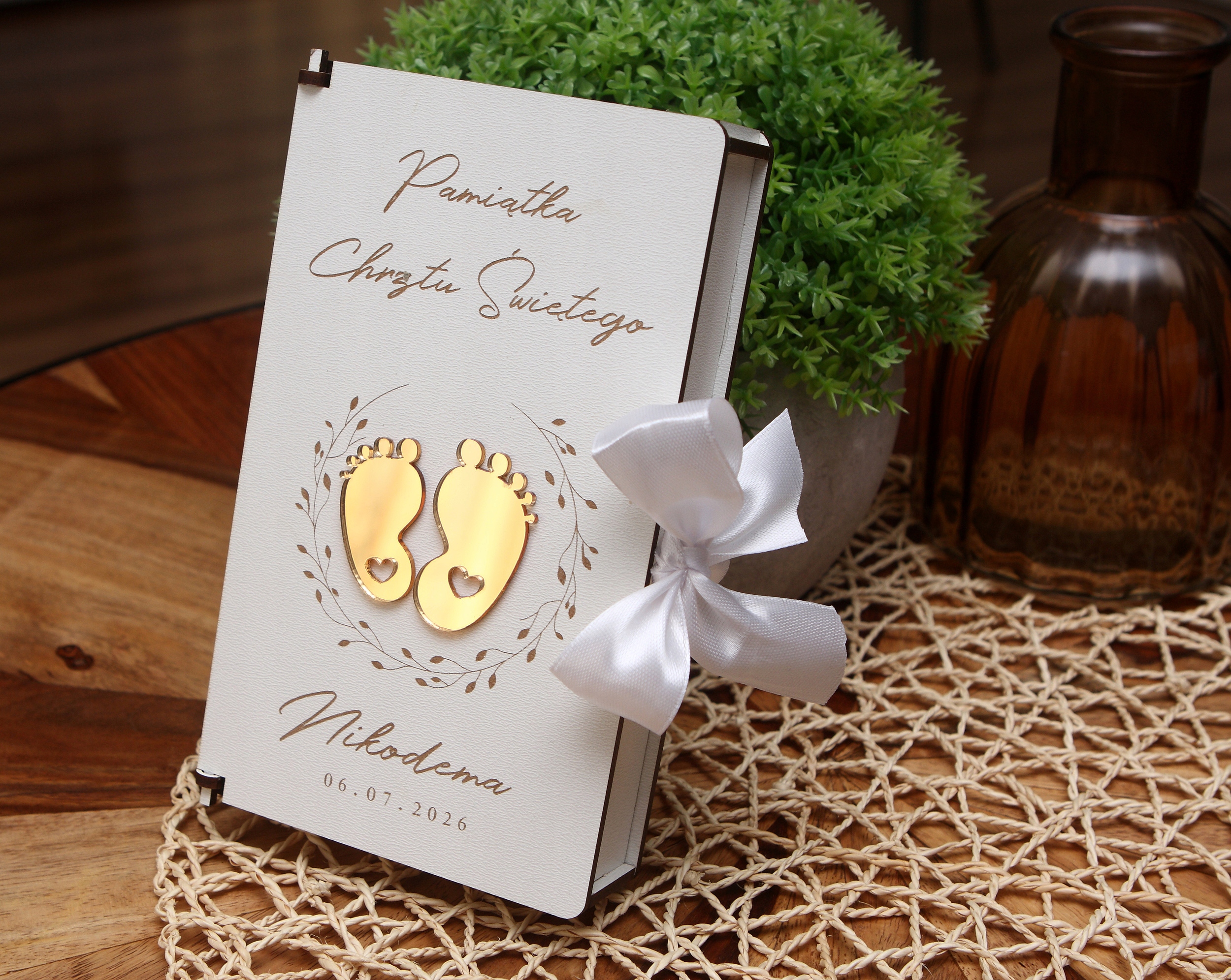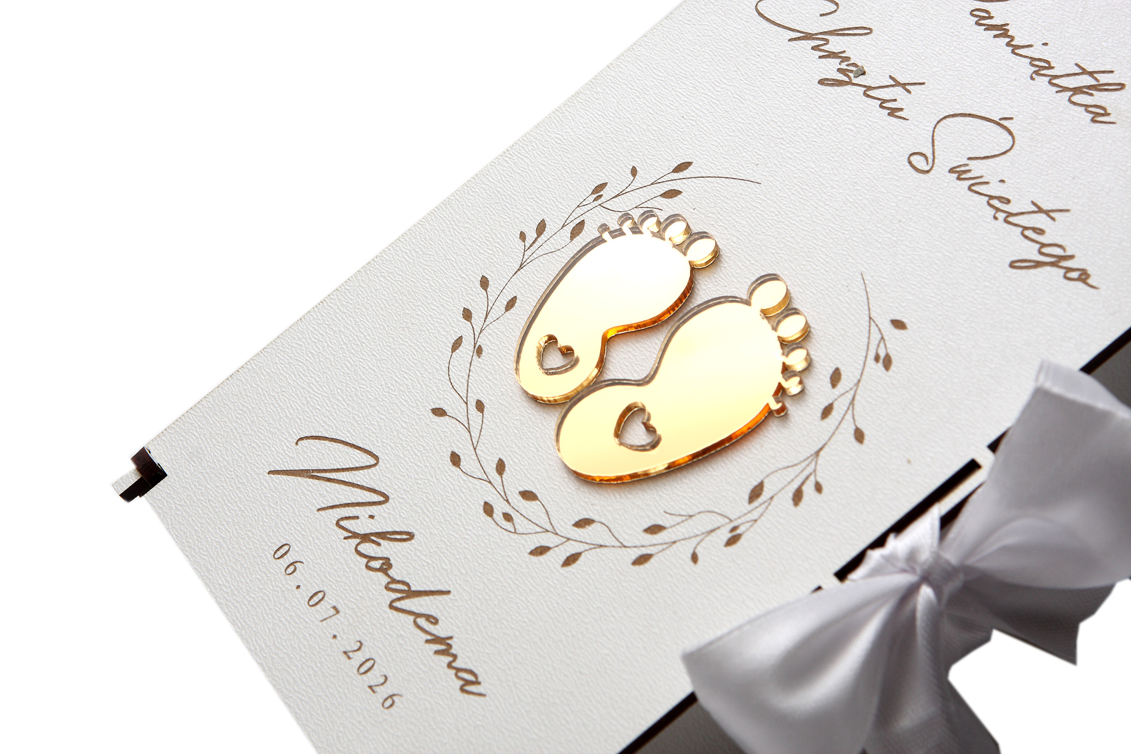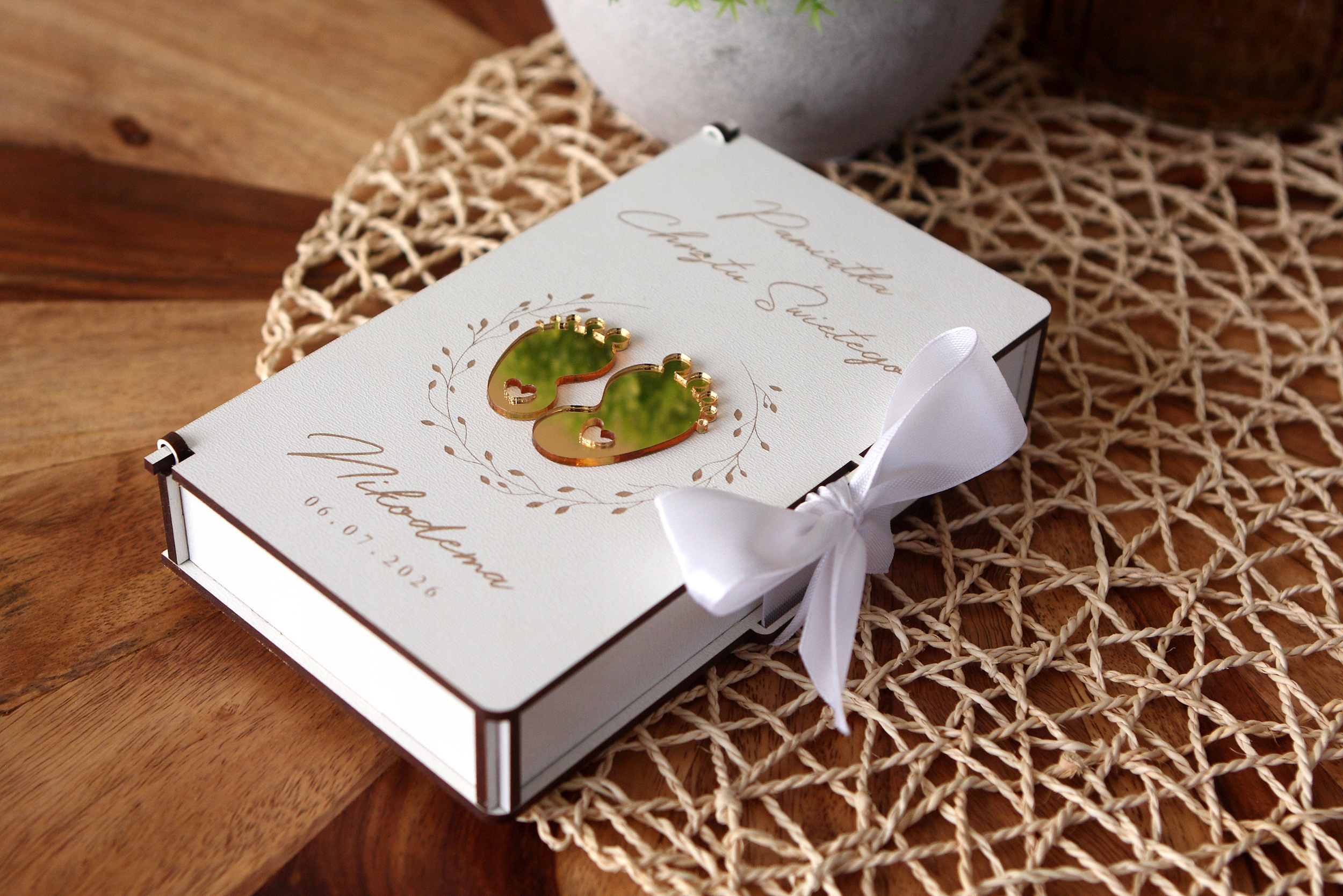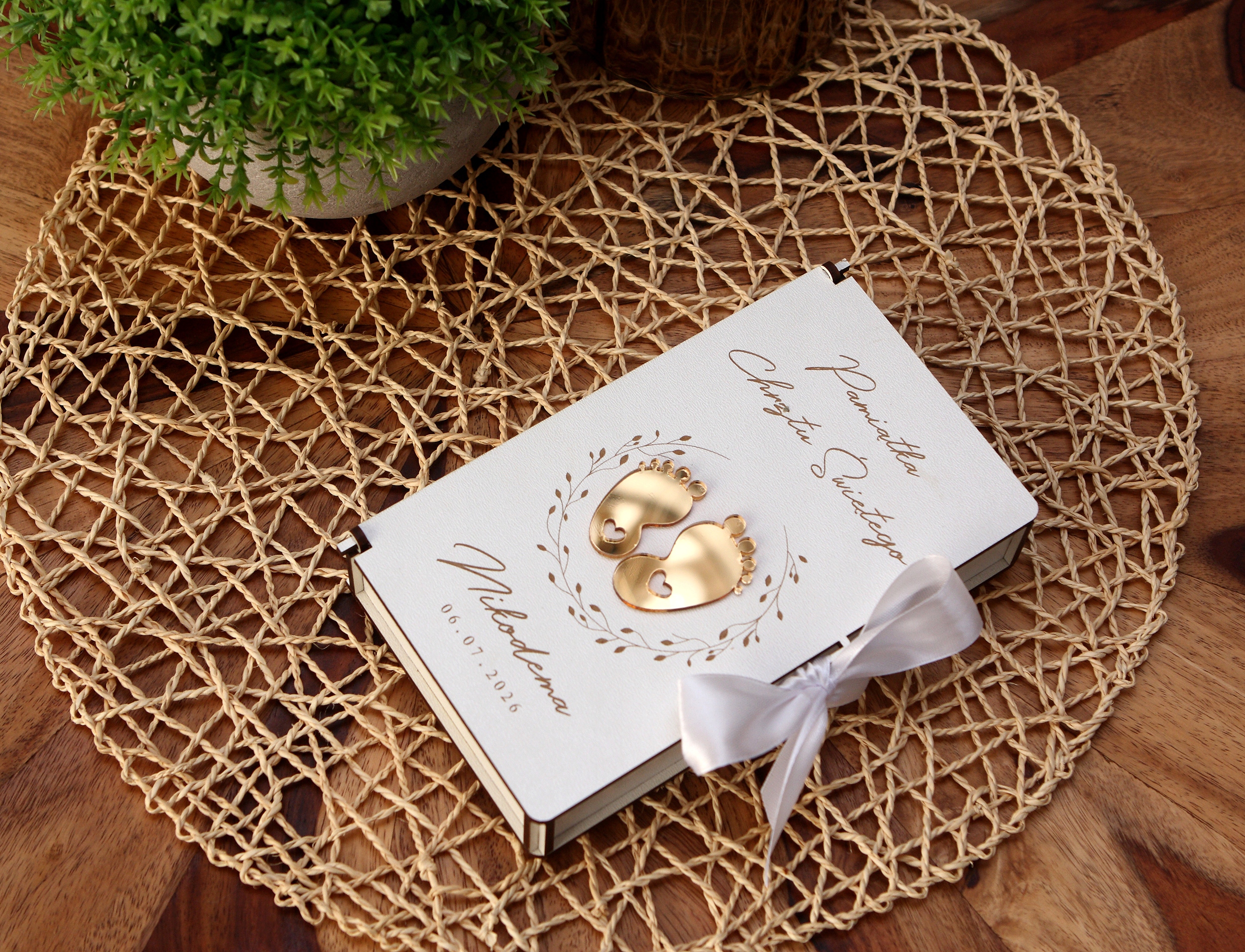 ✅Na zewnątrz pudełka grawerowane jest imię dziecka oraz data uroczystości.
