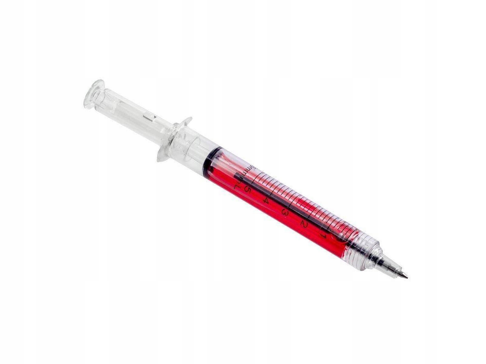 Świetny prezent i super gadżet, dzięki któremu nabierzesz nauczycieli i kolegów w szkole, czy koleżanki i kumpli z pracy, albo pasażerów w autobusie. Długopis do złudzenia przypomina strzykawkę wypełnioną krwią. Więc gdy już wszyscy ochłoną, po tym jak wyciągniesz strzykawkę z kieszeni czy torby i przyłożysz ja mimochodem do ręki, będziesz mógł im napisać: wyluzujcie, wkręciłem was.
