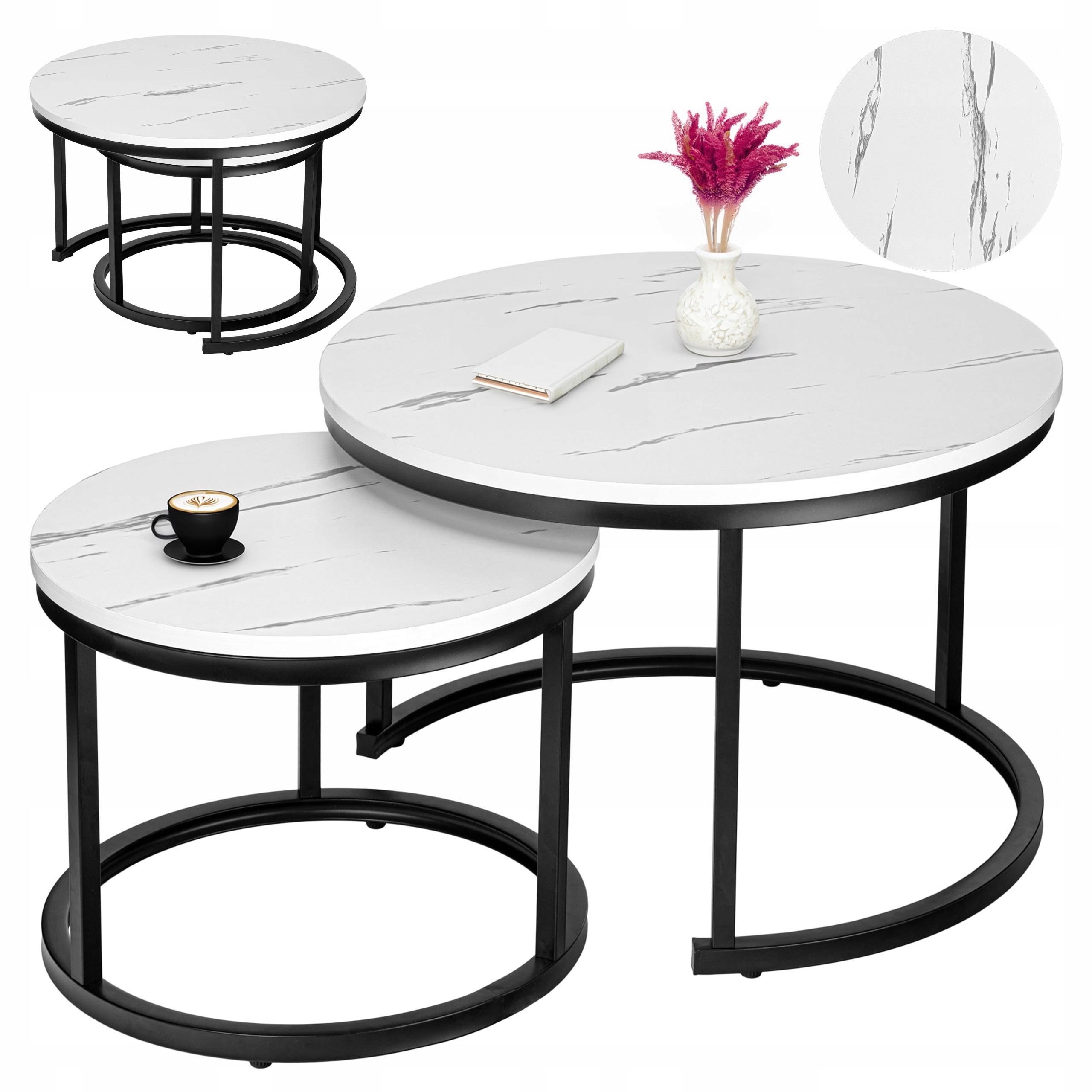 Zestaw stolików Galen Biały Marmur to połączenie nowoczesnego designu i wyjątkowej funkcjonalności, które idealnie wpasuje się w każde wnętrze. Dzięki kompaktowej konstrukcji i możliwości wsunięcia mniejszego stolika pod większy możesz zaoszczędzić przestrzeń, a jednocześnie cieszyć się eleganckim dodatkiem do swojego salonu. Możesz używać ich razem lub osobno, tworząc unikalne kompozycje. Zestaw stolików wykonany jest z solidnej metalowej konstrukcji, a maksymalne obciążenie jednego stolika to aż 75 kg. Galen to zestaw, który łączy estetykę z wygodą użytkowania – doskonały wybór dla wymagających!