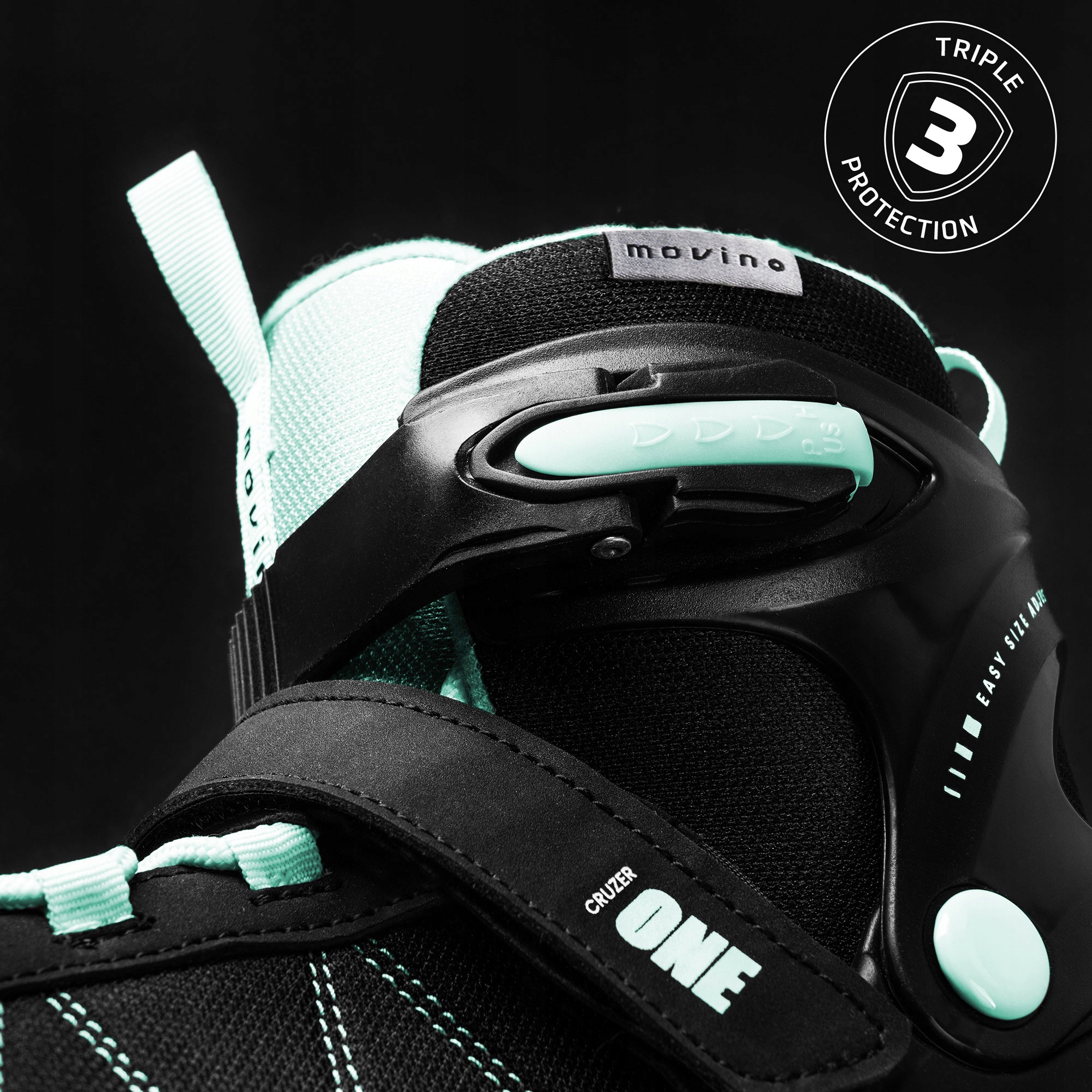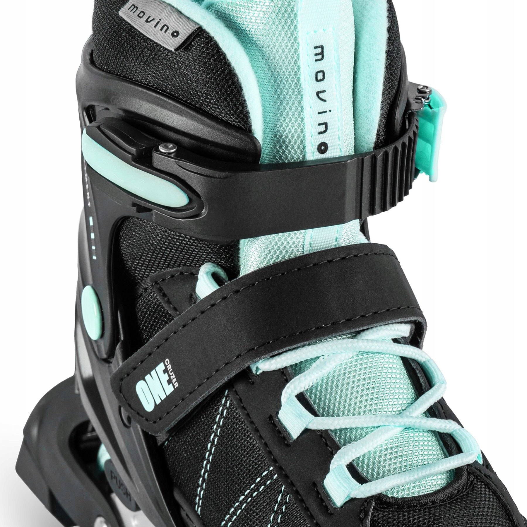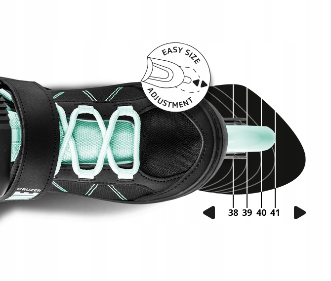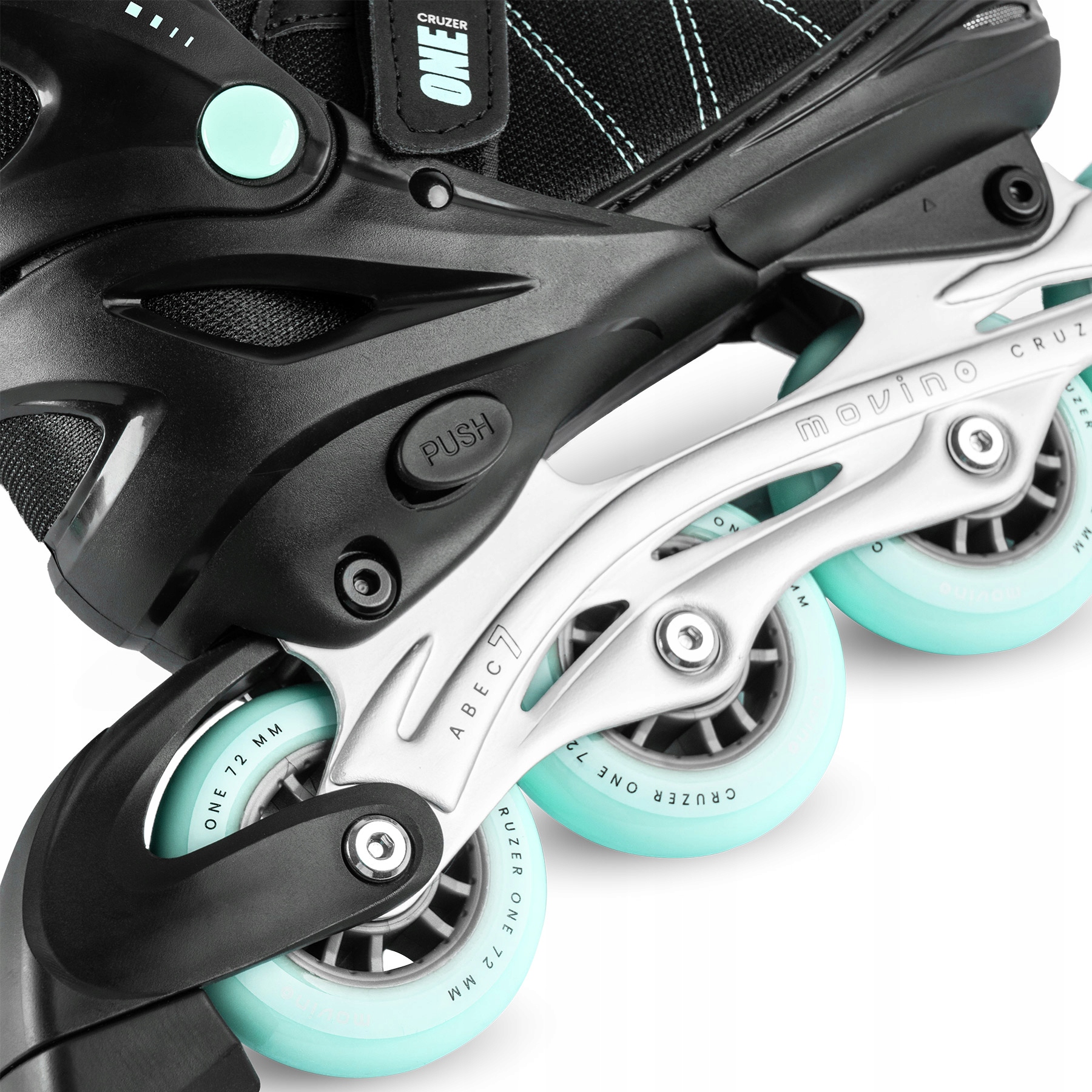 Rolki Movino Cruzer One posiadają szybki i niezawodny system regulacji rozmiaru za pomocą jednego przycisku. Czterostopniowy zakres między rozmiarem 38-41 pozwala dopasować but do stopy o długości między 24-26cm.
