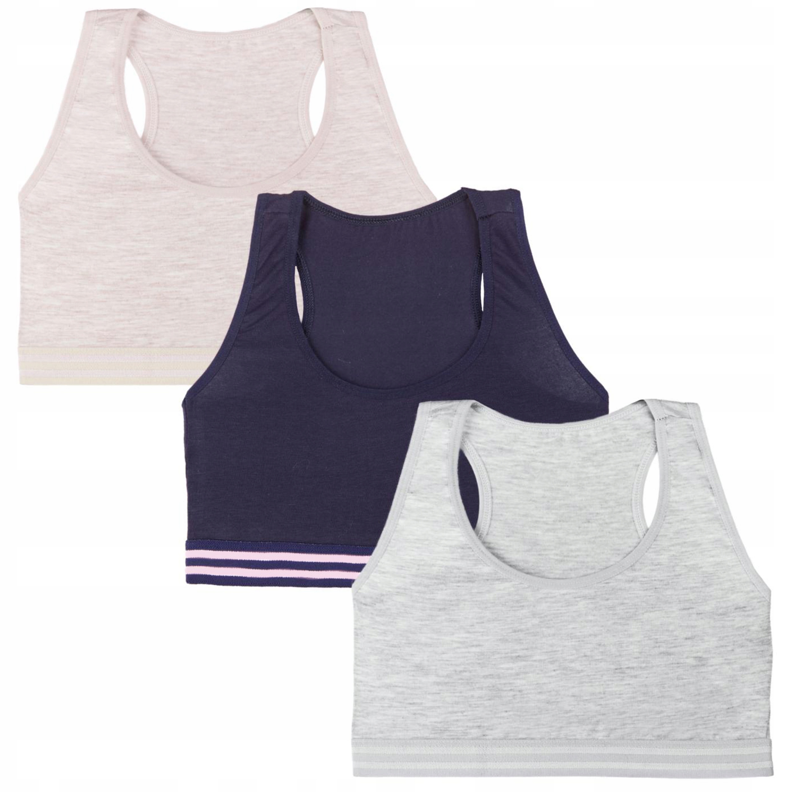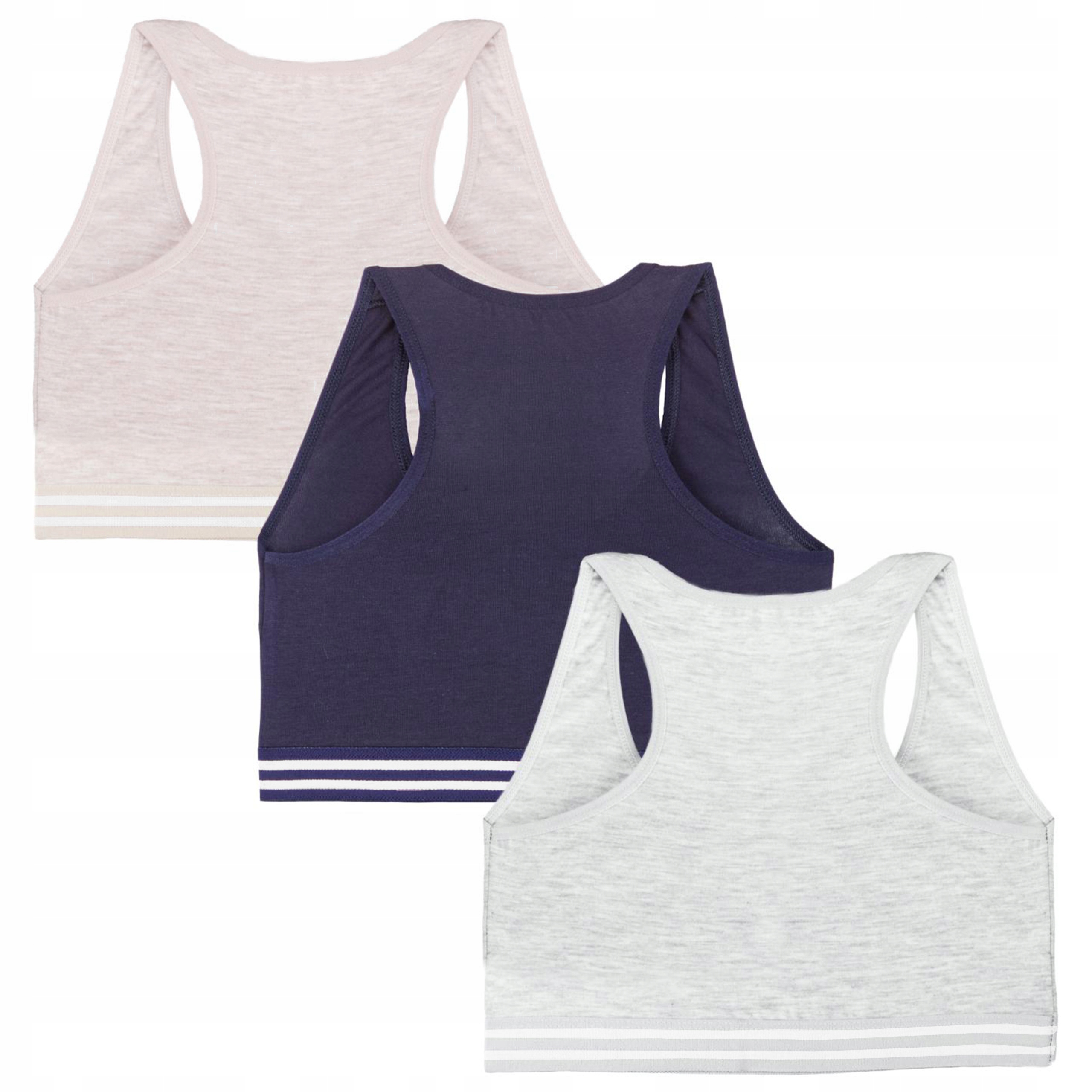 W zestawie staniczki w kolorze beżowym, szarym i granatowym