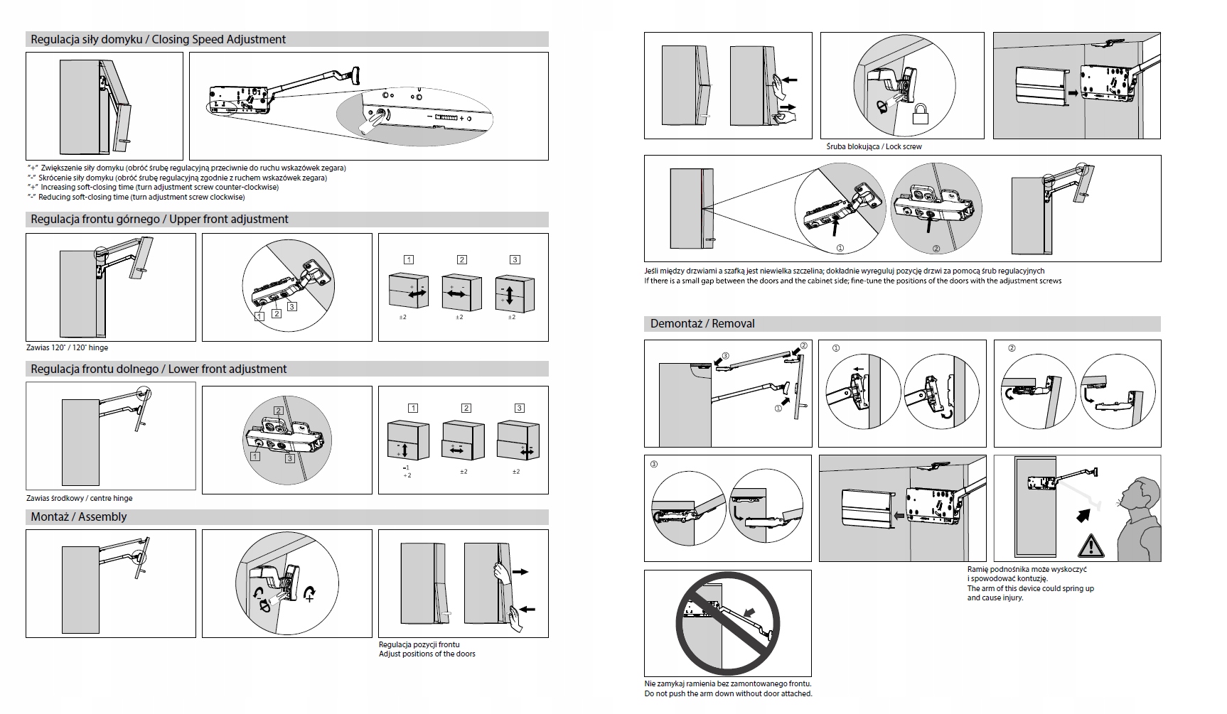 Oferta dotyczy kompletnego zestawu od montażu 2 symetrycznych frontów. Podnośnik jest stosowany głównie w konstrukcjach górnych szafek z frontami łamanymi. Dwuczęściowy front unosi się i składa się podczas otwierania, przez co masz cały czas wygodny dostęp do uchwytu. Dzięki wielopoziomowej regulacji możesz ustawić podnośnik według własnych preferencji. Mechanizm posiada wbudowany hamulec, dzięki temu zamkniesz szafkę bez obawy przed trzaśnięciem. Ponad to, możesz ją zatrzymać w dowolnym momencie.