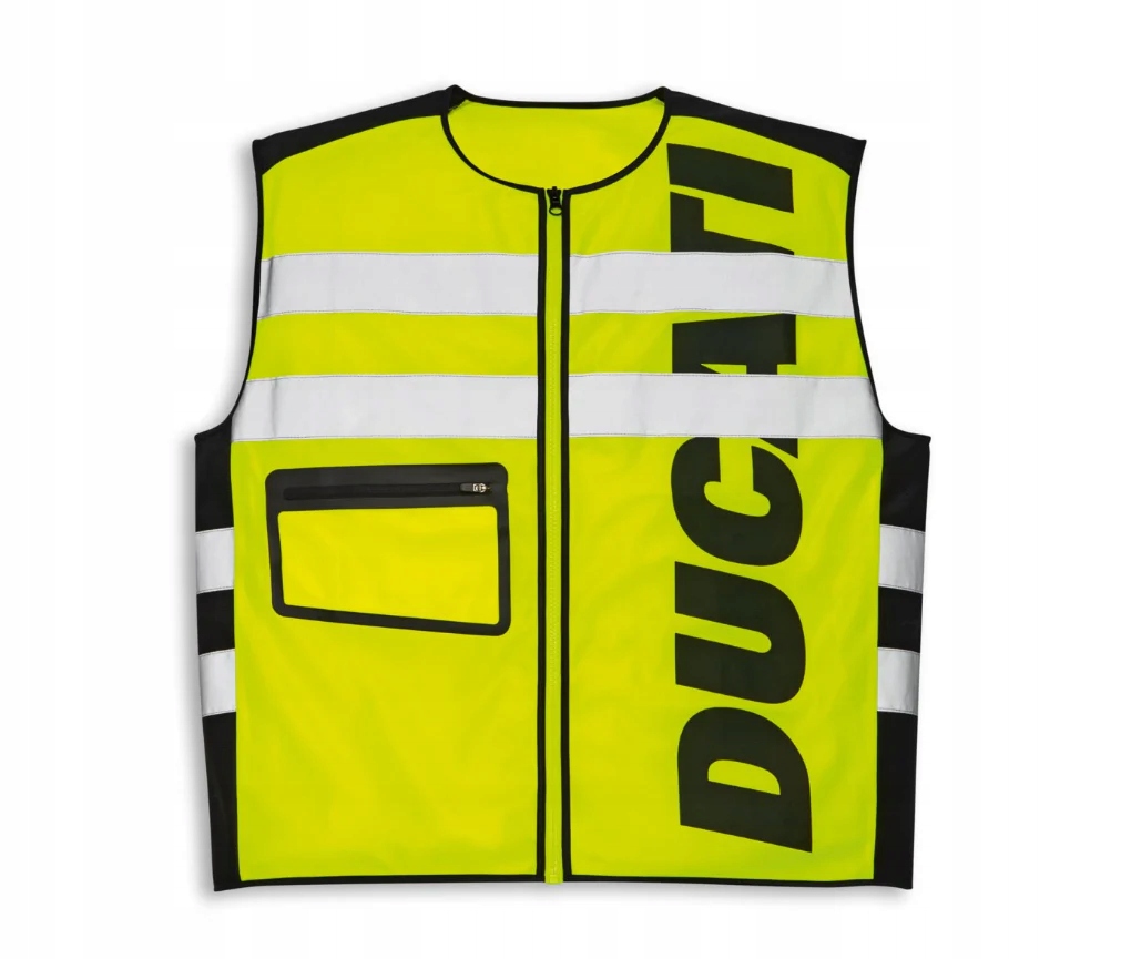 Kamizelka HV zaprojektowana specjalnie dla motocyklisty w przypadku słabej widoczności. Wykonana z rozciągliwej i oddychającej tkaniny poliestrowej, posiadającej certyfikaty HV, jest również wyposażona w odblaskowe paski na obwodzie zapewniające widoczność w nocy. Lekka i praktyczna, można ją szybko zdjąć i łatwo spakować do dołączonego etui. Duża kieszeń na piersi umożliwia zabranie ze sobą dokumentów i rzeczy osobistych. Logo umieszczone z przodu i z tyłu sprawia, że kamizelka idealnie pasuje do każdego innego wyposażenia ochronnego, dzięki czemu nigdy nie będziesz musiał rezygnować ze swojego niepowtarzalnego stylu Ducati.