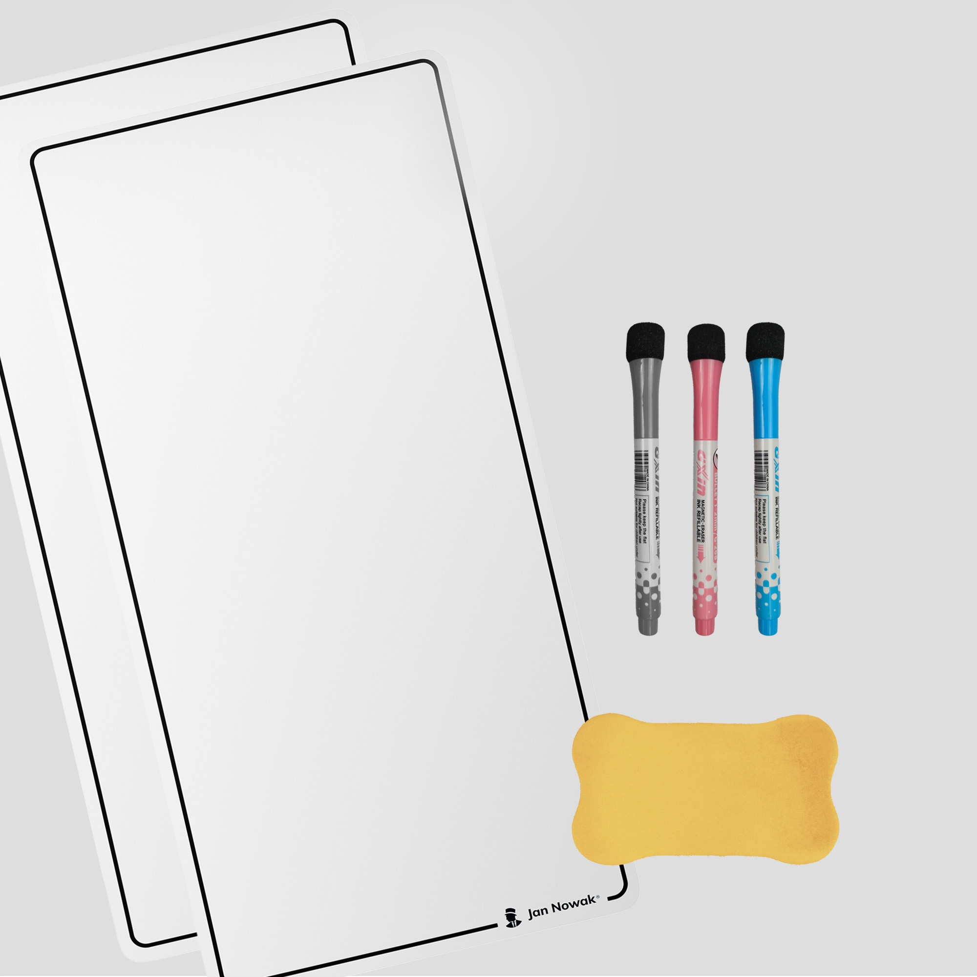 W zestawie papierowa tuba, dwa flipcharty magnetyczne z czarną ramką o wymiarach 400 x 800 mm, gąbka magnetyczna i 3 markery do tablicy w kolorze czarnym, czerwonym i niebieskim.