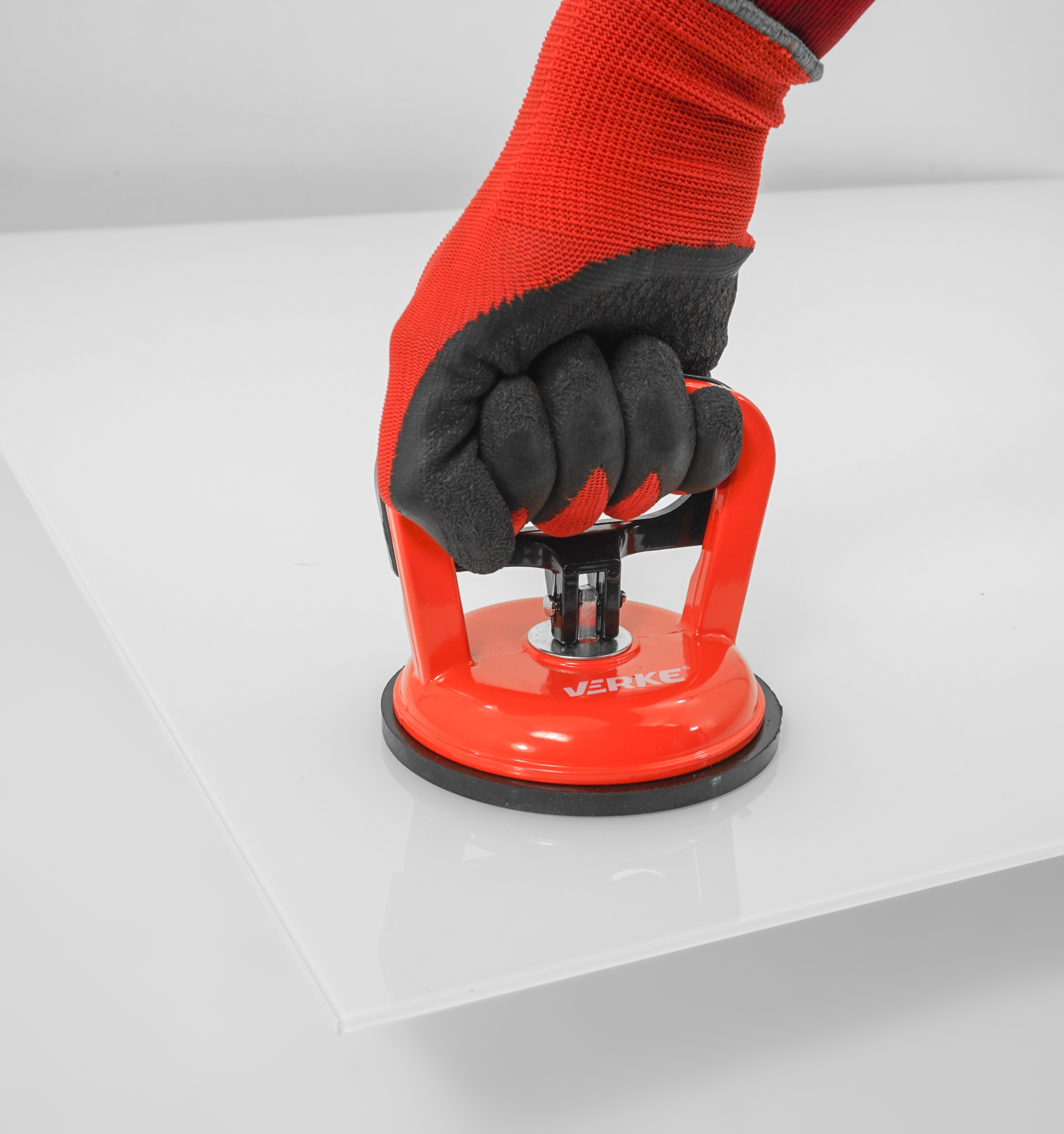 Prosty, ale efektywny mechanizm zasysający umożliwia pewne i stabilne przyleganie do gładkich powierzchni. Dzięki temu można łatwo przenosić takie materiały jak szkło, lakierowane płyty, płyty z tworzywa, pleksiglas i inne gładkie materiały.
