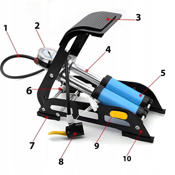 ➡️ posiada gumową stopkę, która zapobiega ześlizgnięciu się nogi podczas pompowania