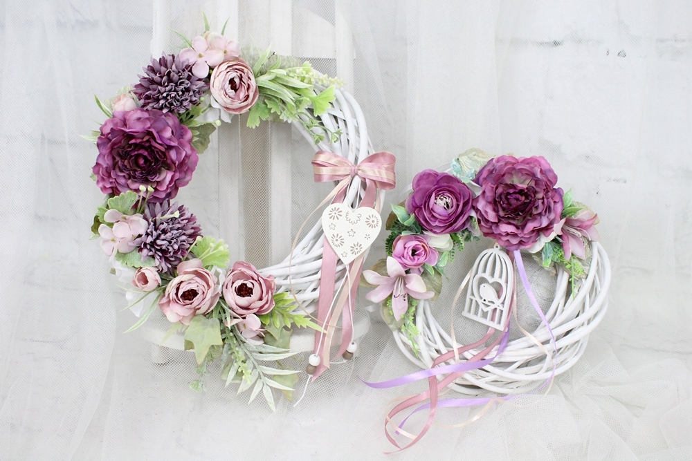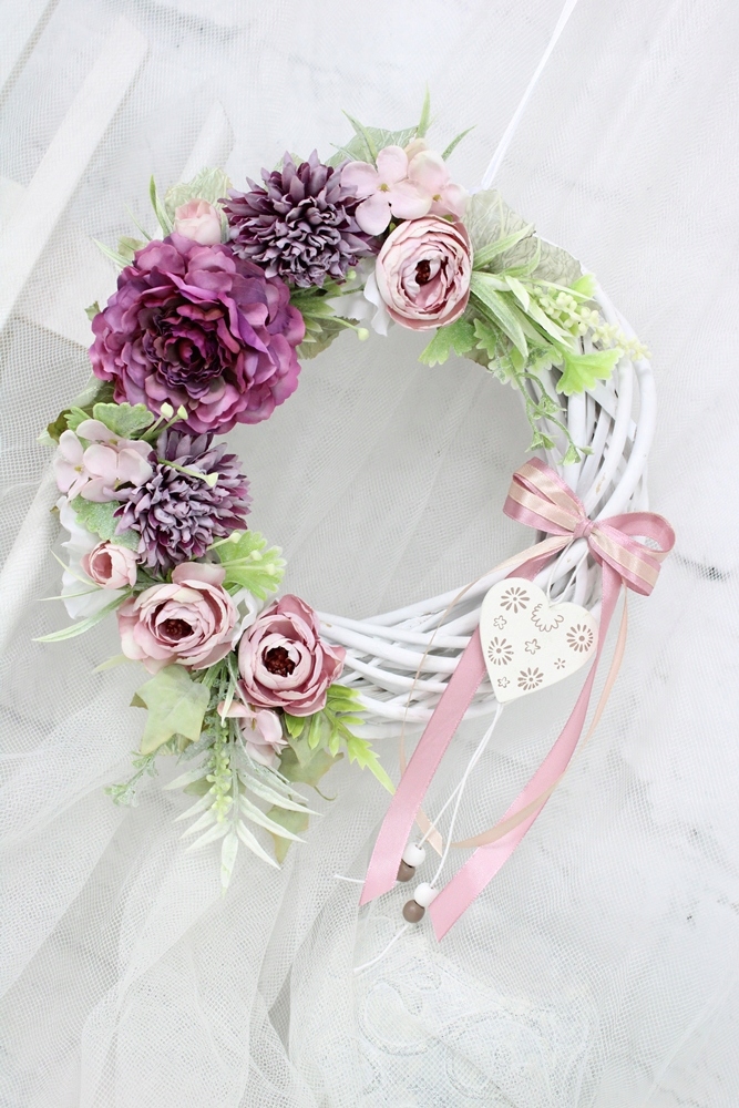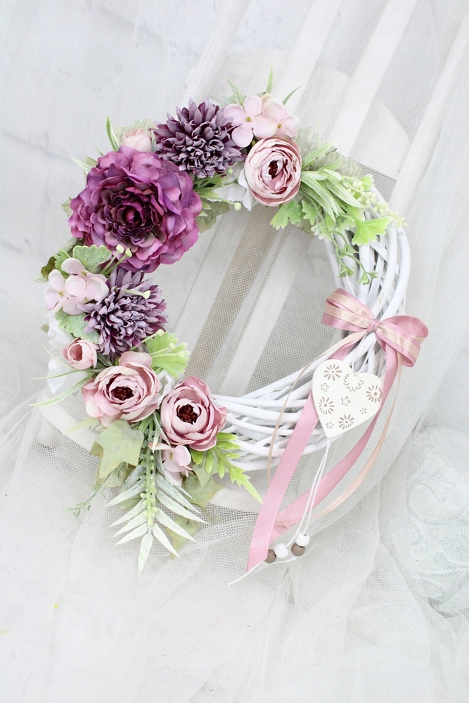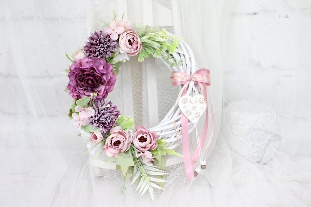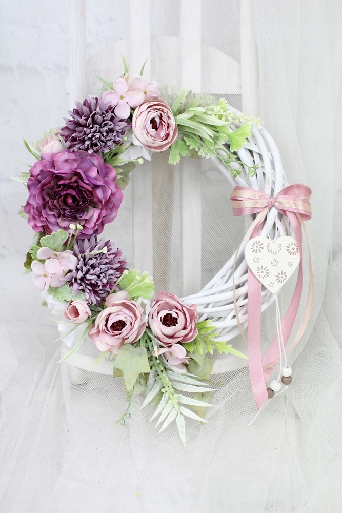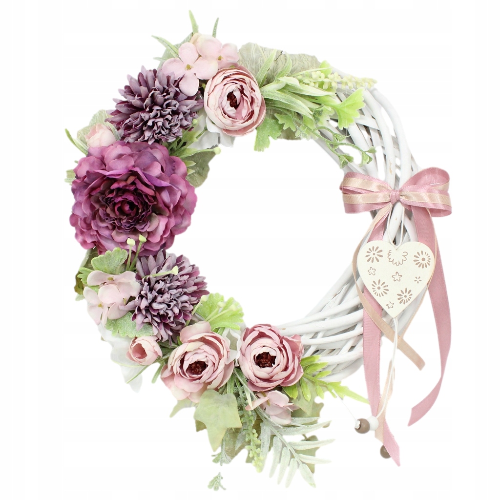 Kwiatowy wianek wiklinowy o średnicy 25cm z dekoracją 27-29cm Udekorowany kwiatami peoni, dali i pełnika w zgaszonych odcieniach fioletu i różu.