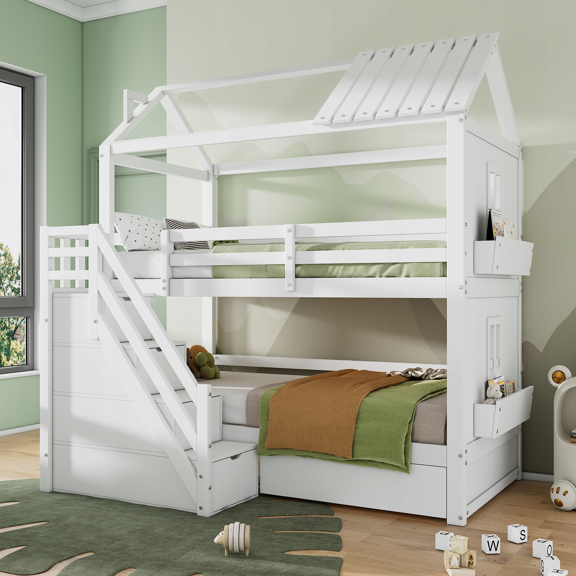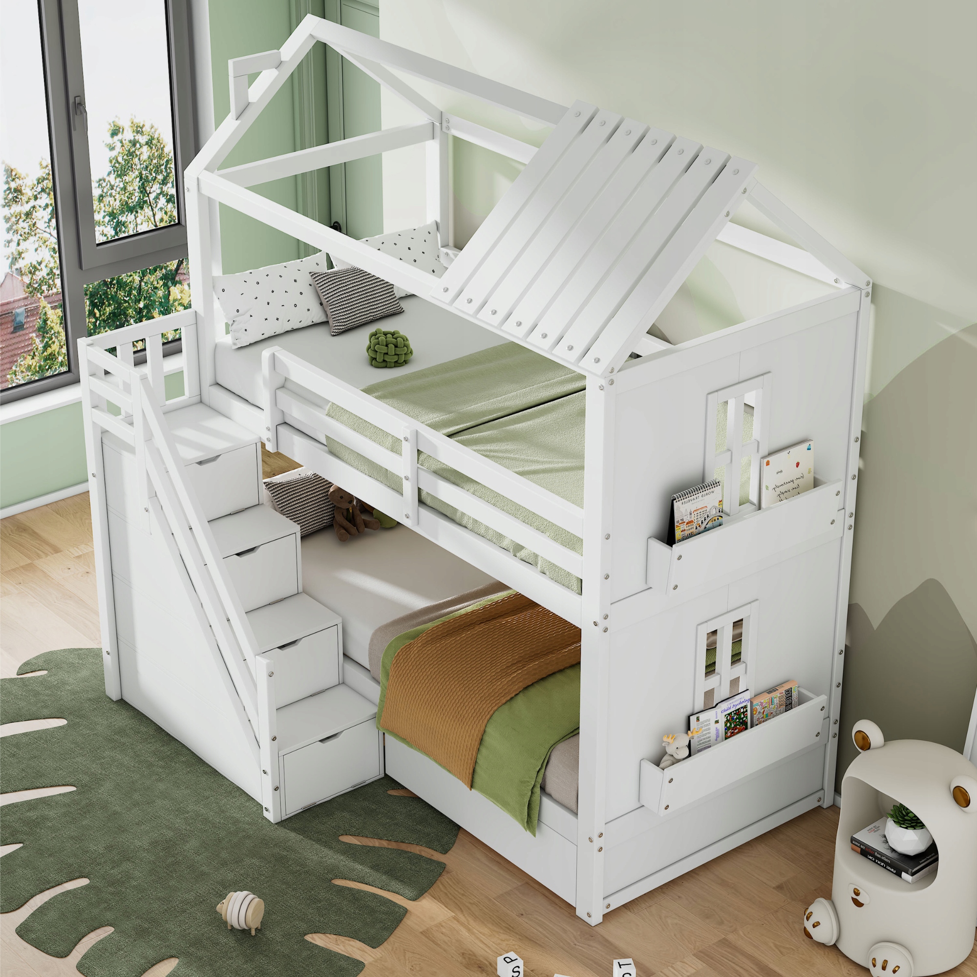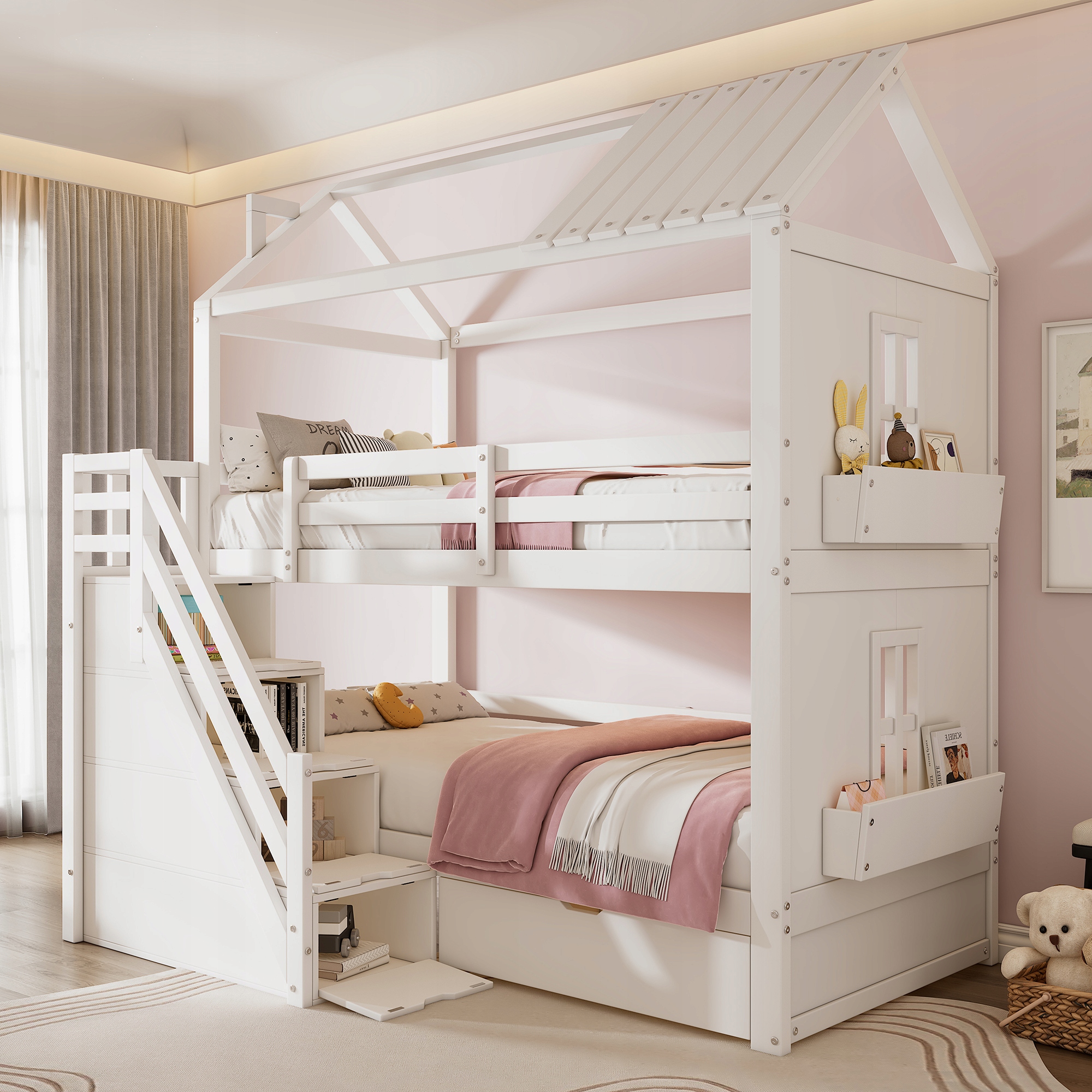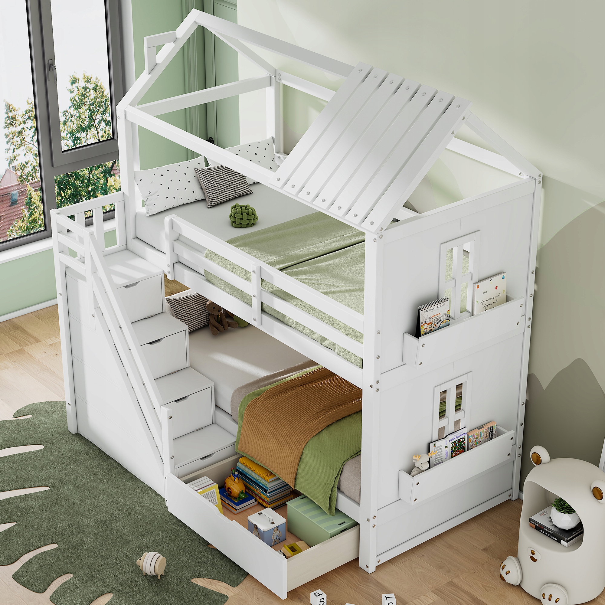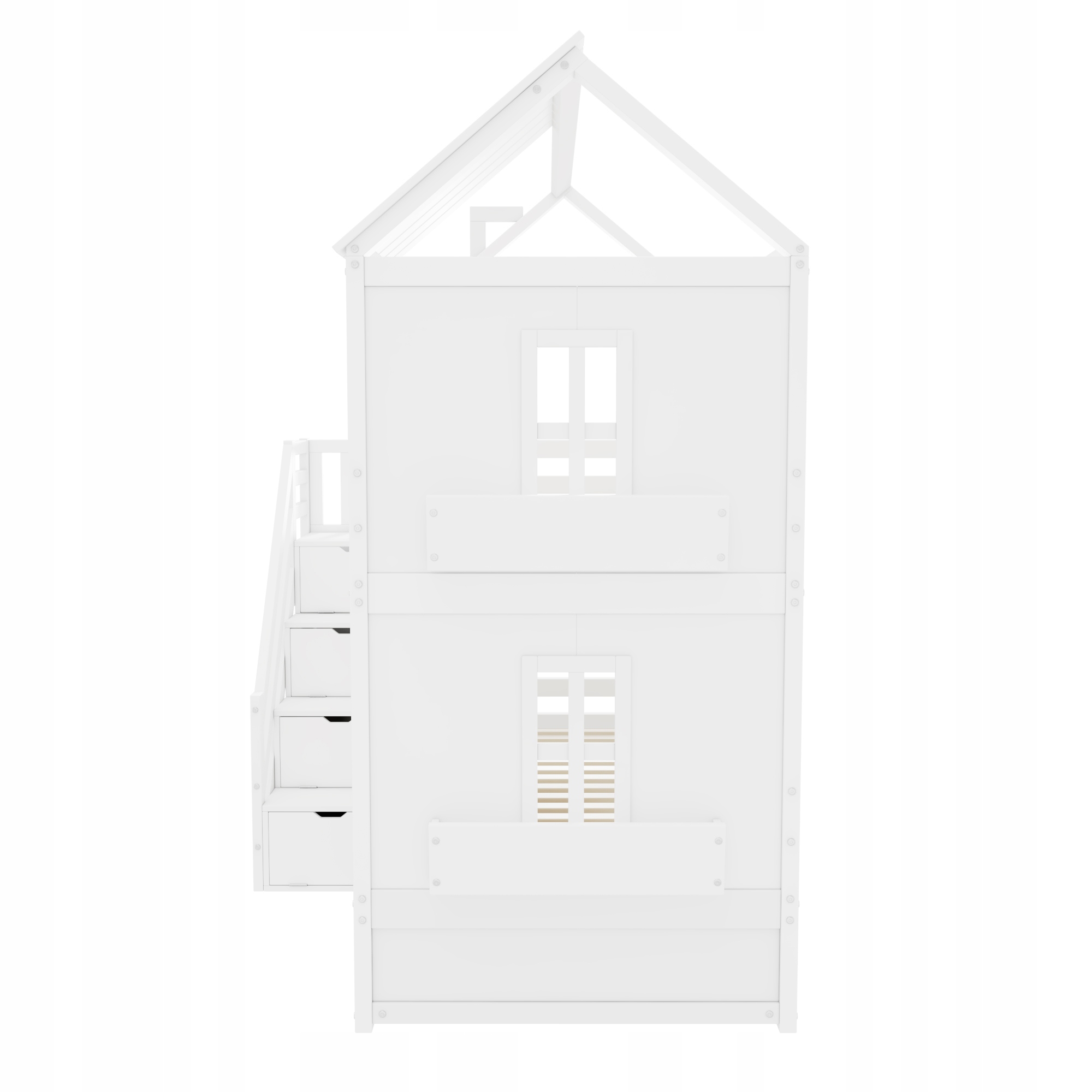 Łóżko piętrowe dla dzieci, 90*200 cm, wielofunkcyjne łóżko dla dzieci, ze schodami do przechowywania oraz szufladami i półkami, bardzo duża przestrzeń do przechowywania, bez materaca, sosna + MDF, biały