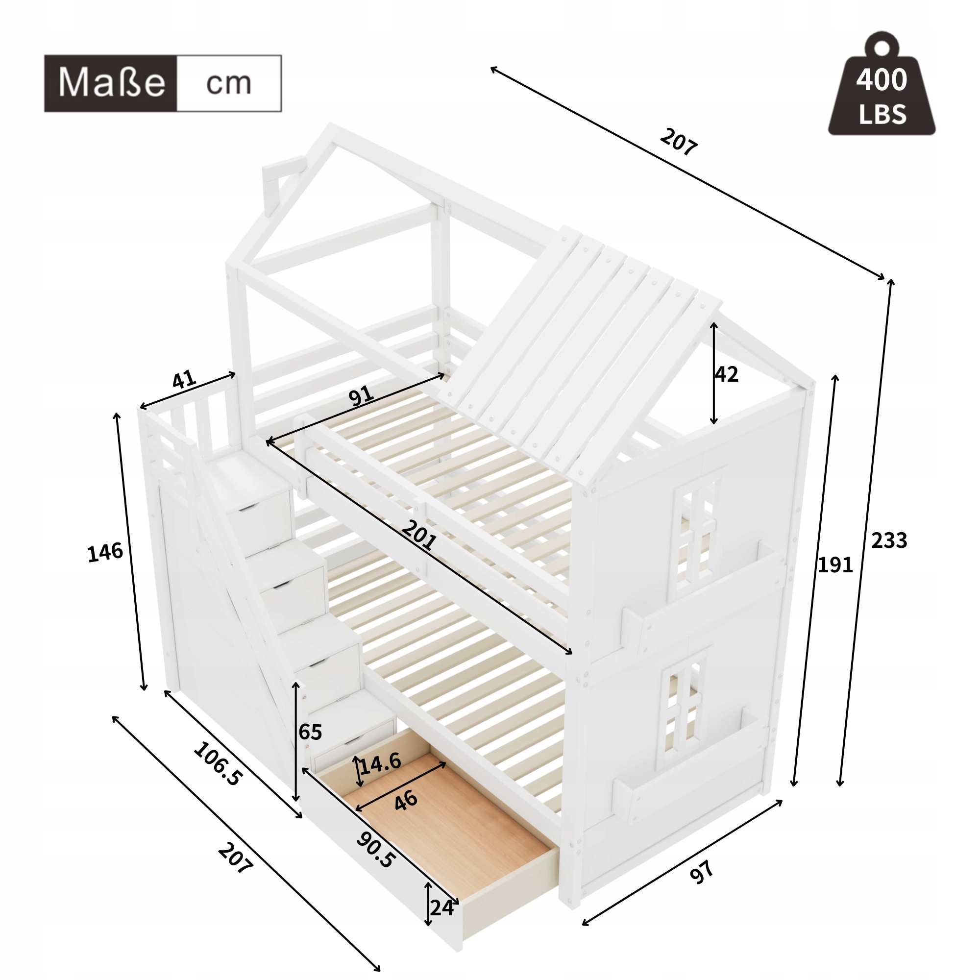 Bardzo duża przestrzeń do przechowywania: Szuflady pod łóżkiem i schodami zapewniają dużo miejsca do przechowywania, ułatwiając rodzicom i dzieciom organizowanie różnych przedmiotów oraz poprawiając porządek i wydajność pokoju.