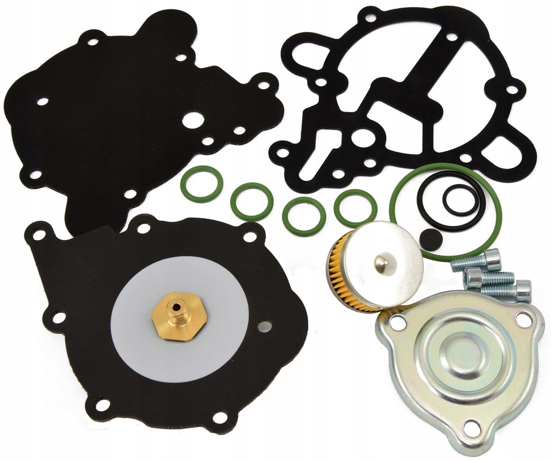 Это оригинальный итальянский комплект деталей, предоставленный производителем редуктора для его регенерации. Помимо мембран, он также содержит фильтр жидкой фазы вместе с прокладками для редуктора AT-09 и крышка корпуса этого фильтра.