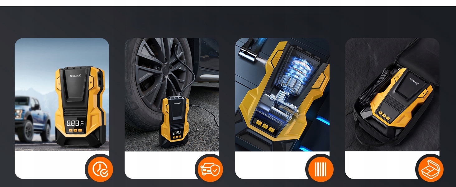 Pompa może szybko napompować opony przy maksymalnym ciśnieniu 150 PSI i przepływie powietrza 36 l/min. W ciągu zaledwie 1 minuty pompka może napompować oponę od 25 do 36 PSI, a w ciągu 5 minut całkowicie napompować oponę samochodową od 0 do 36 PSI. Idealnie nadaje się do pompowania samochodów, motocykli, hulajnóg, rowerów, piłek i innych dmuchańców.