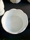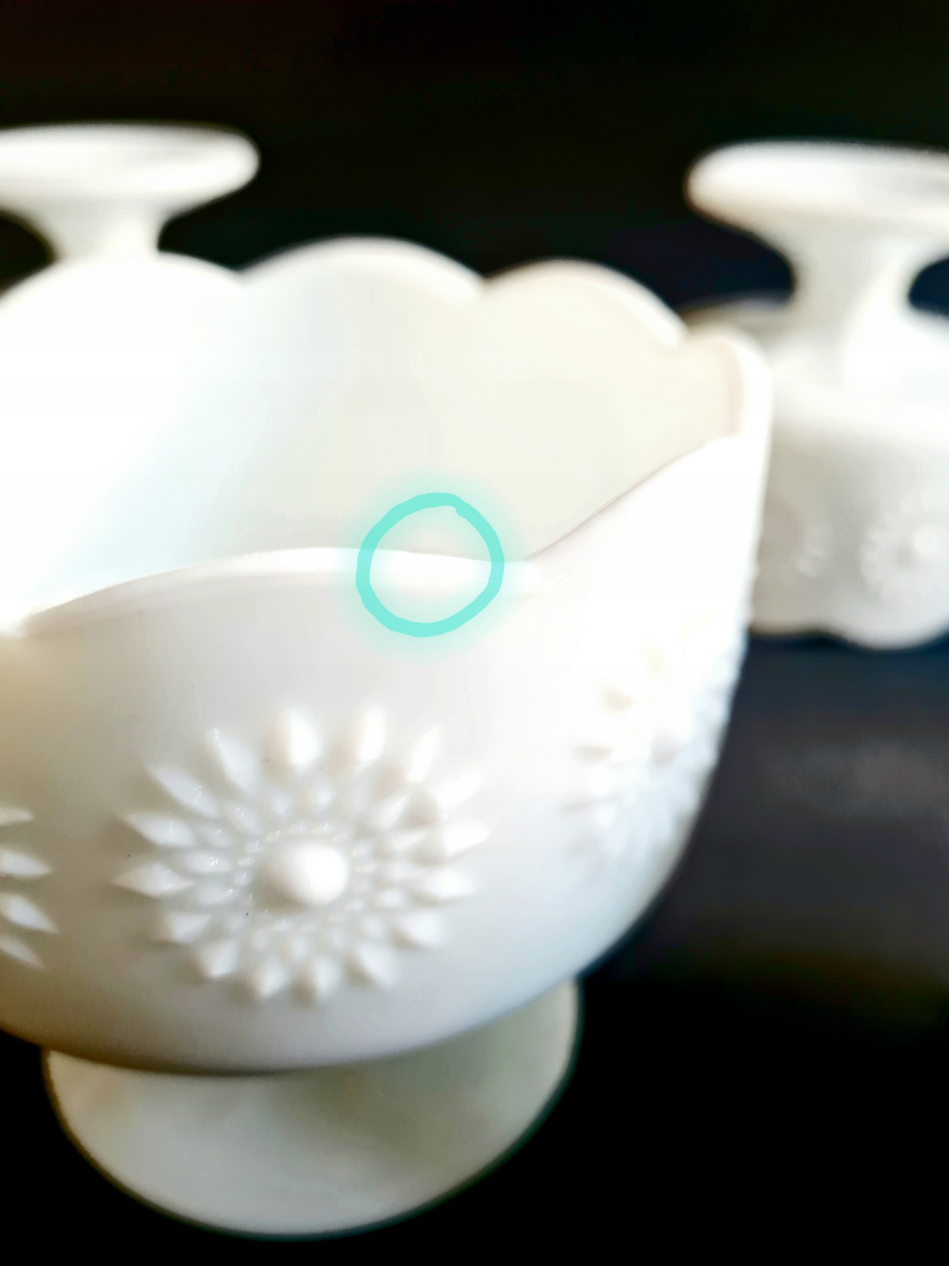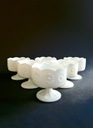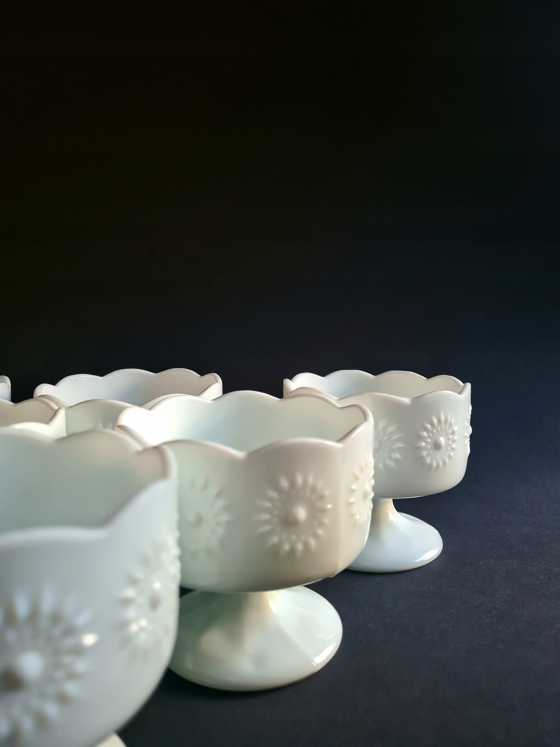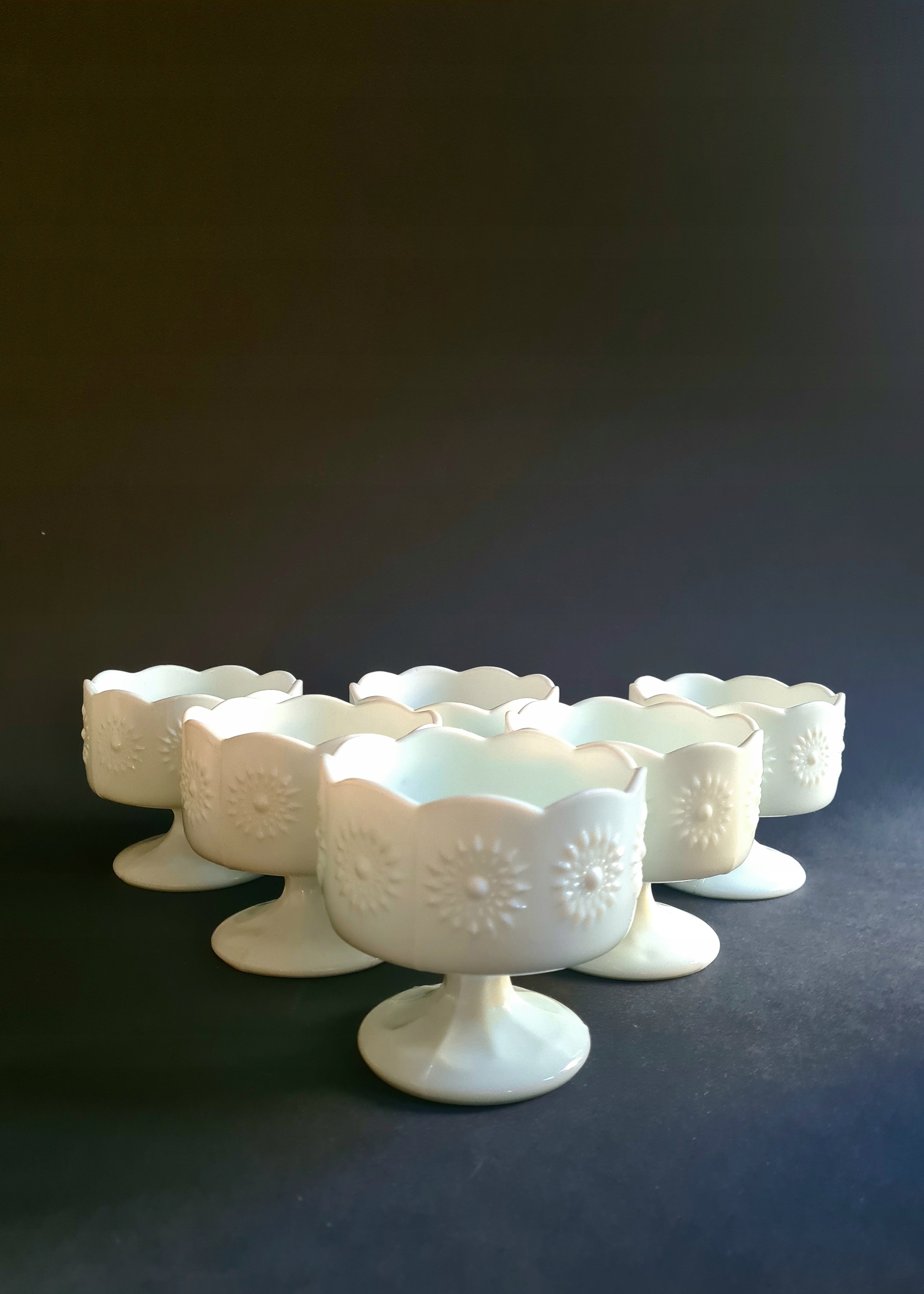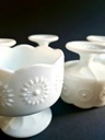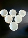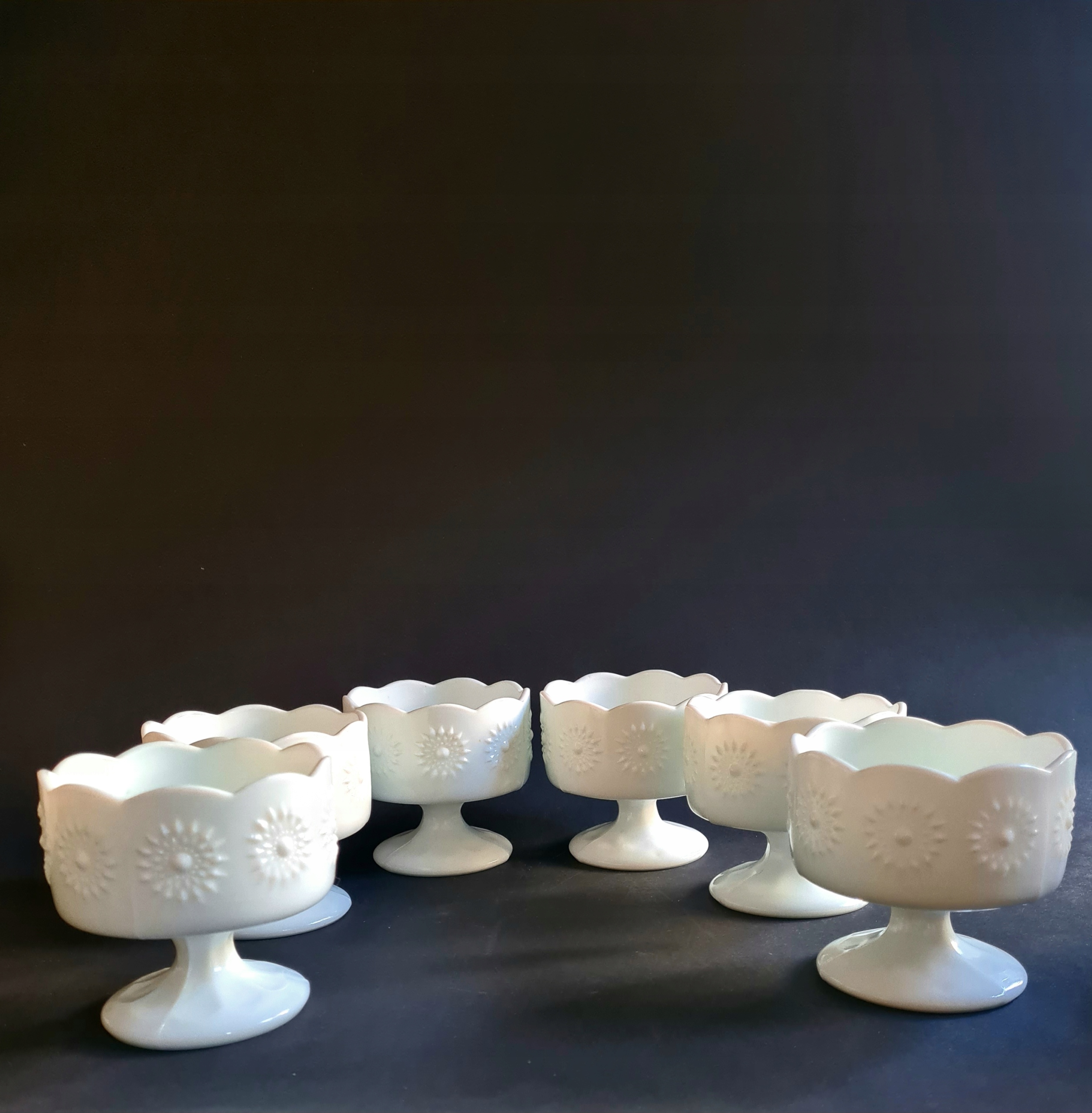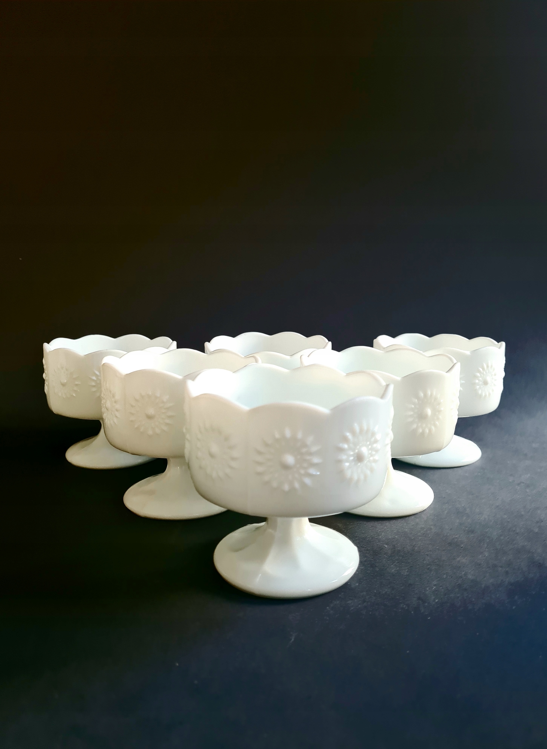 Zestaw bardzo wdzięcznych pucharków z mlecznego szkła, tzw lattimo wyprodukowane w HSG Ząbkowice. Popularny wzór stokrotki, Przedmiot zachowany w bardzo ładnym stanie. W zestawie 6 sztuk