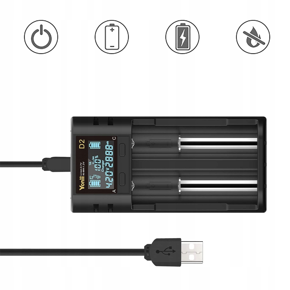 Szybka ładowarka Yonii D2 18650 z boczną szyną wejściową 5 V 2 A i grubym kablem USB.