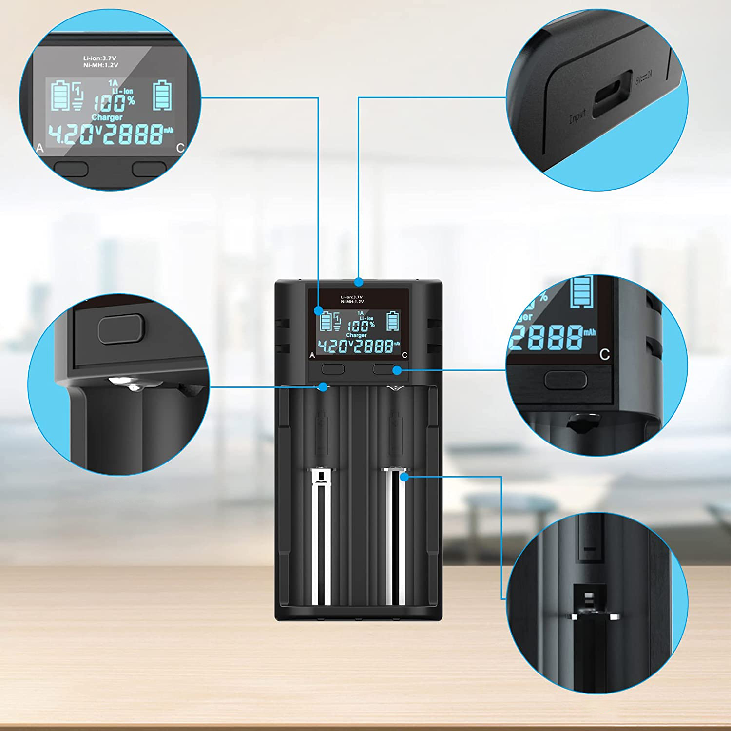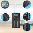 |- Z inteligentnym wyświetlaczem LCD, łatwym do odczytania i użytkowania. Przycisk "C" może przełączać różne informacje o ładowaniu, takie jak czas ładowania, pojemność ładowania, napięcie akumulatora i prąd ładowania. Wyświetlacz pokazuje stan ładowania i zatrzymuje się automatycznie po jego zakończeniu.