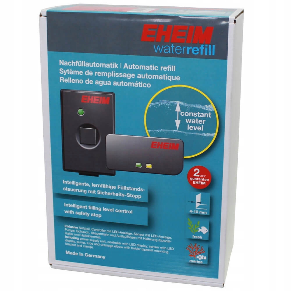 Eheim Waterrefill to nowoczesna automatyczna dolewka do akwariów słodkowodnych i morskich. Służy do utrzymywania stałego poziomu wody w akwarium. Wyposażona w elektroniczny sterownik z sygnalizacją w postaci kolorowych diod led. W zestawie niskonapięciowa energooszczędna pompa i komplet akcesoriów.