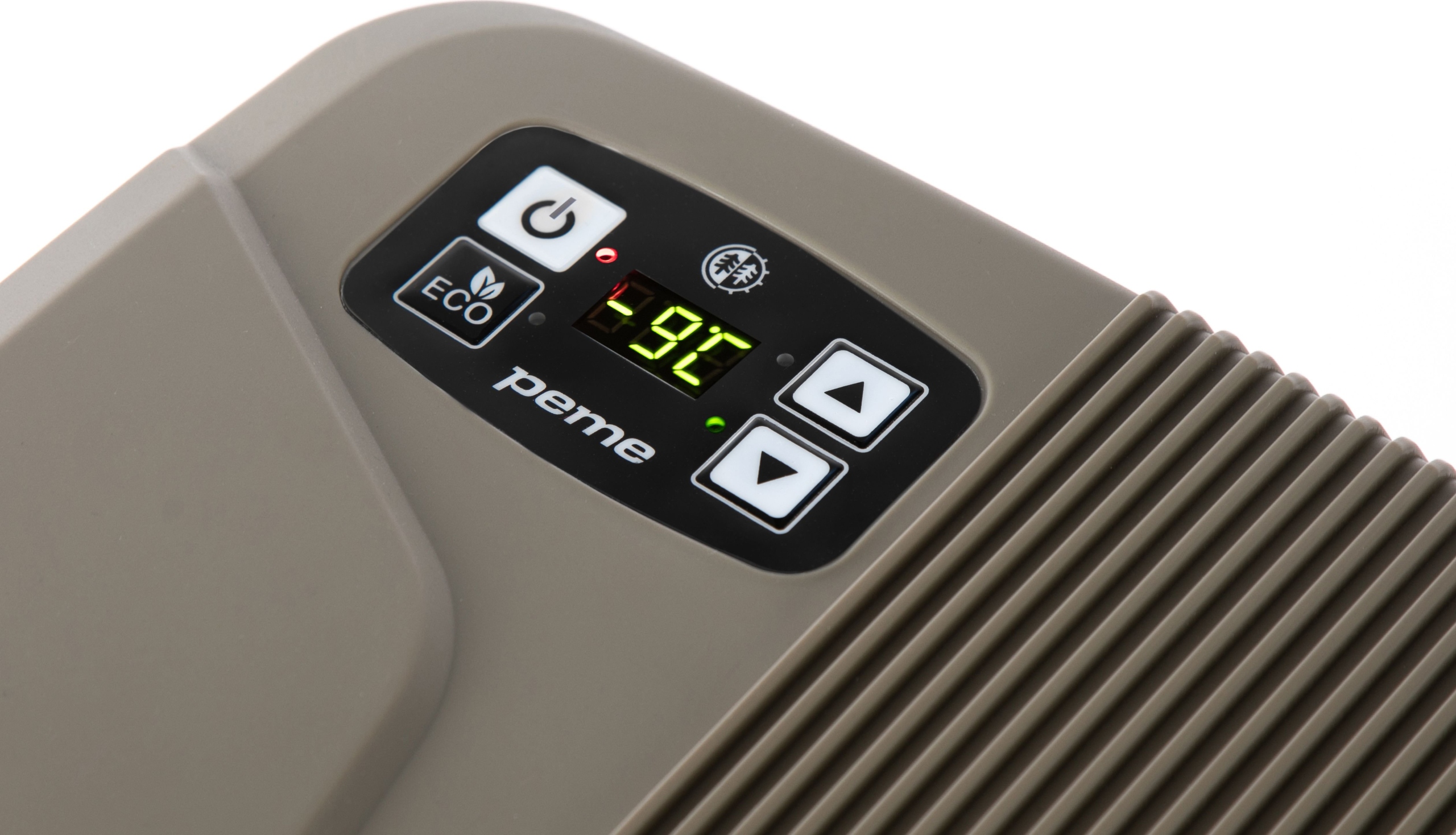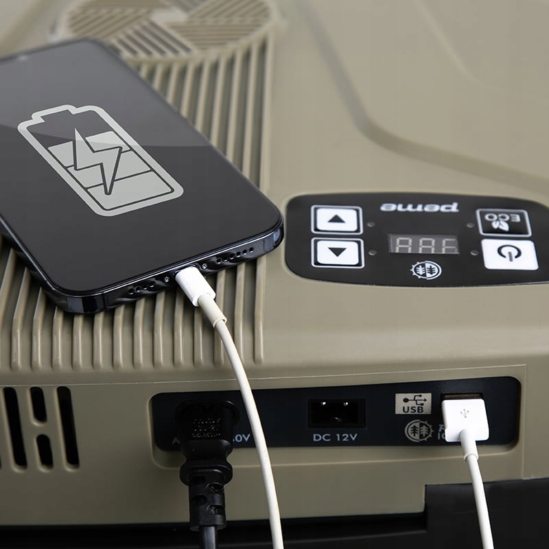 Lodówka Peme jest zasilana sieciowo lub z gniazdka zapalniczki samochodowej. Port USB pozwala ładować urządzenia mobilne, a tryb ECO uruchamiany na żądanie lub automatycznie po osiągnięciu wybranej temperatury umożlwia oszczędzać pobór energii.