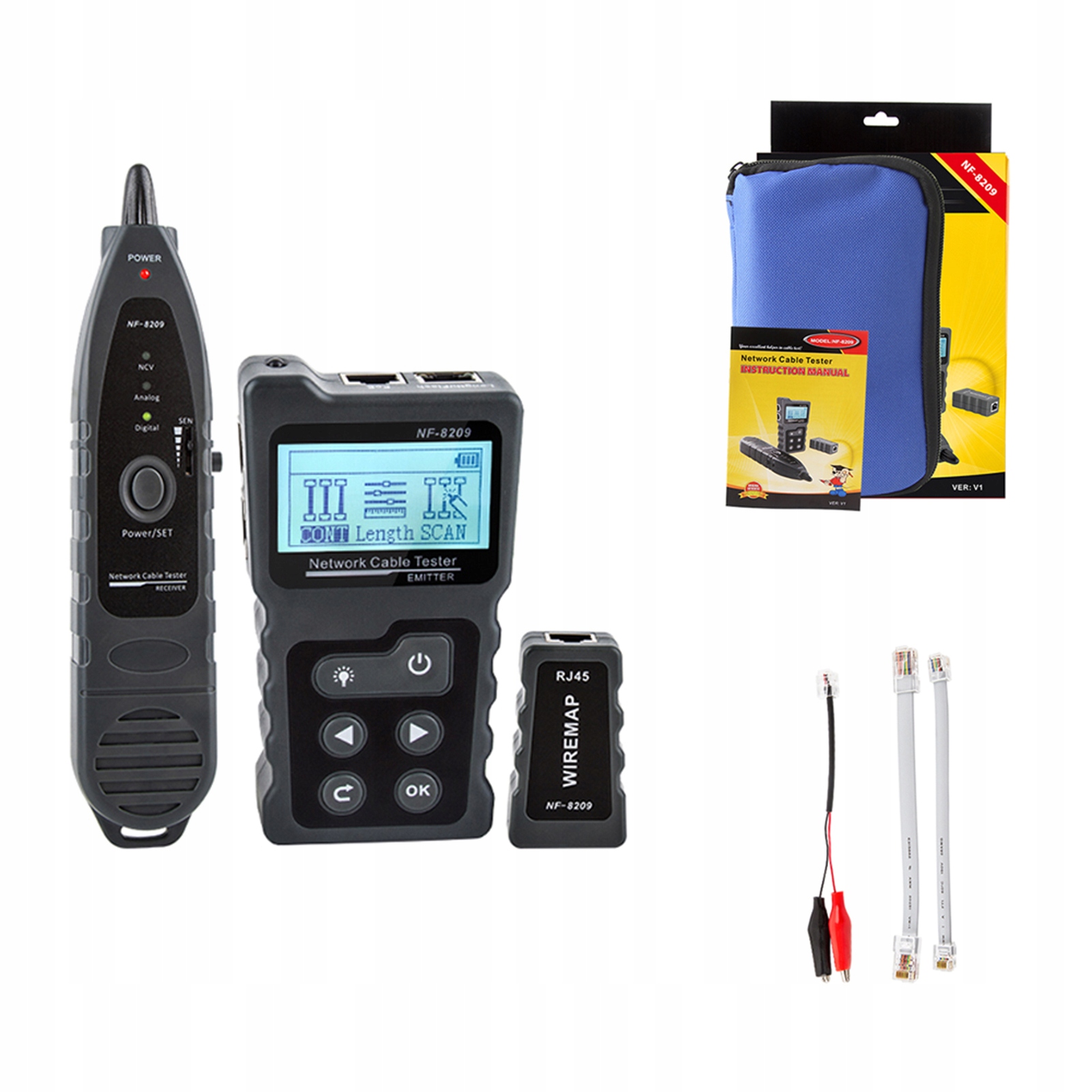Tester okablowania NF-8209 to nowoczesny tester o zaawansowanych funkcjach. Testuje poprawność połączenia wykrywając takie uszkodzenia jak przerwa, zwarcie, odwrócone pary. Dodatkowo wyposażony jest w generator sygnału oraz szukacz par, dzięki czemu umożliwia wyszukanie konkretnego przewodu w plątaninie kabli.