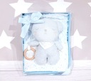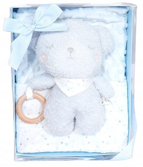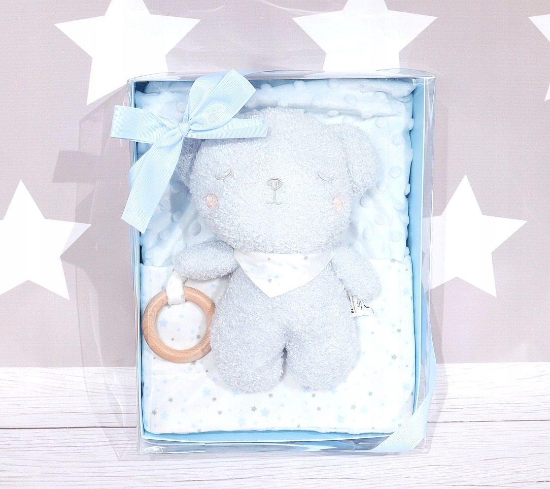 ✨ NIEBIESKI ZESTAW PREZENTOWY – KOCYK MINKY + MASKOTKA Z DREWNIANYM GRYZAKIEM ✨