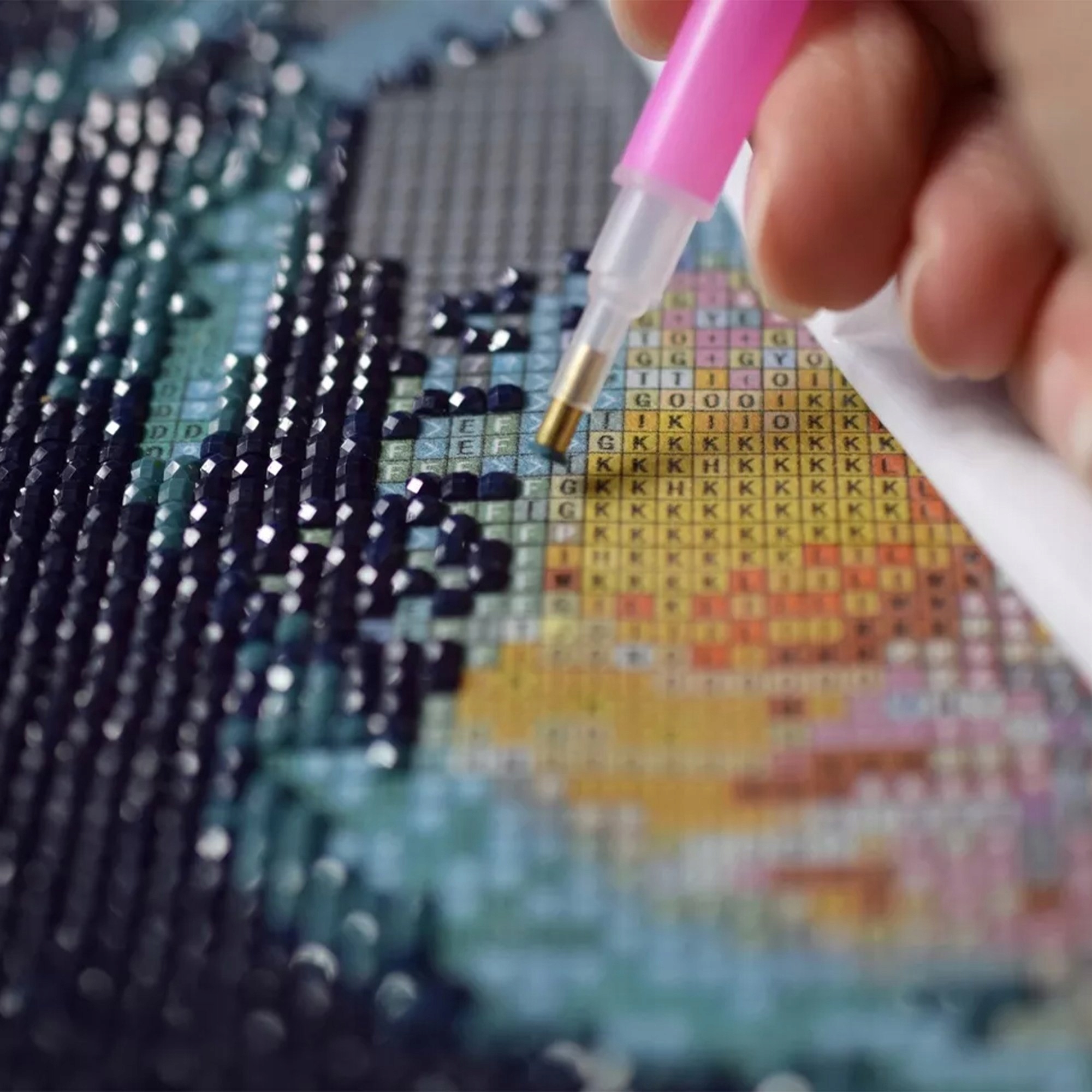 3️⃣ Rozpocznij wyklejanie – używając aplikatora, przyklejaj diamenciki zgodnie z oznaczeniami na płótnie.