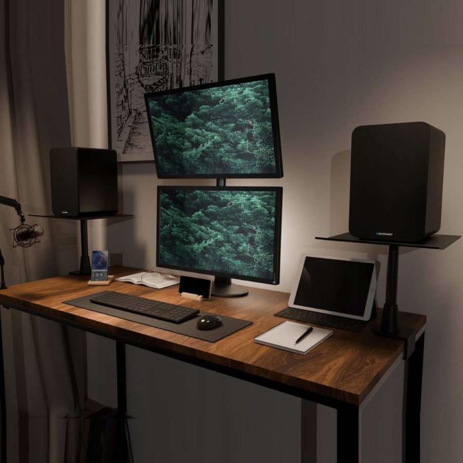 Zestaw dwóch głośników półkowych do różnych zastosowań. Głośniki mogą być używane do telewizora, komputera, a także do łączenia się ze smartfonem. Model ten ma wbudowany moduł Bluetooth, wejścia: HDMI (ARC), optyczne i RCA dla zewnętrznych źródeł dźwięku. Dostępny jest również odtwarzacz USB. Wbudowany wzmacniacz ma moc wyjściową 2 x 25 W RMS. Głośniki mają obudowę MDF typu bass-reflex i pilota zdalnego sterowania dla wygodnej obsługi.
