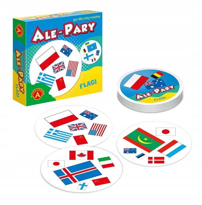 Gry „ALE PARY – Flagi” to zabawa pełna emocji, w której możesz sprawdzić i ćwiczyć swoją spostrzegawczość i refleks. Zasady gry są proste – na każdej odsłoniętej parze kart należy jak najszybciej znaleźć ten sam obrazek. Gra ma wyjątkowy walor edukacyjny, ponieważ parując dwa takie same obrazki z flagą, gracz musi podać nazwę kraju do którego dana flaga należy. Oczywiście gra zaopatrzona jest w instrukcję, na której znajdziemy nazwy wszystkich flag, dzięki czemu możemy się z nimi zapoznać przed zabawą. Dwa warianty zabawy.