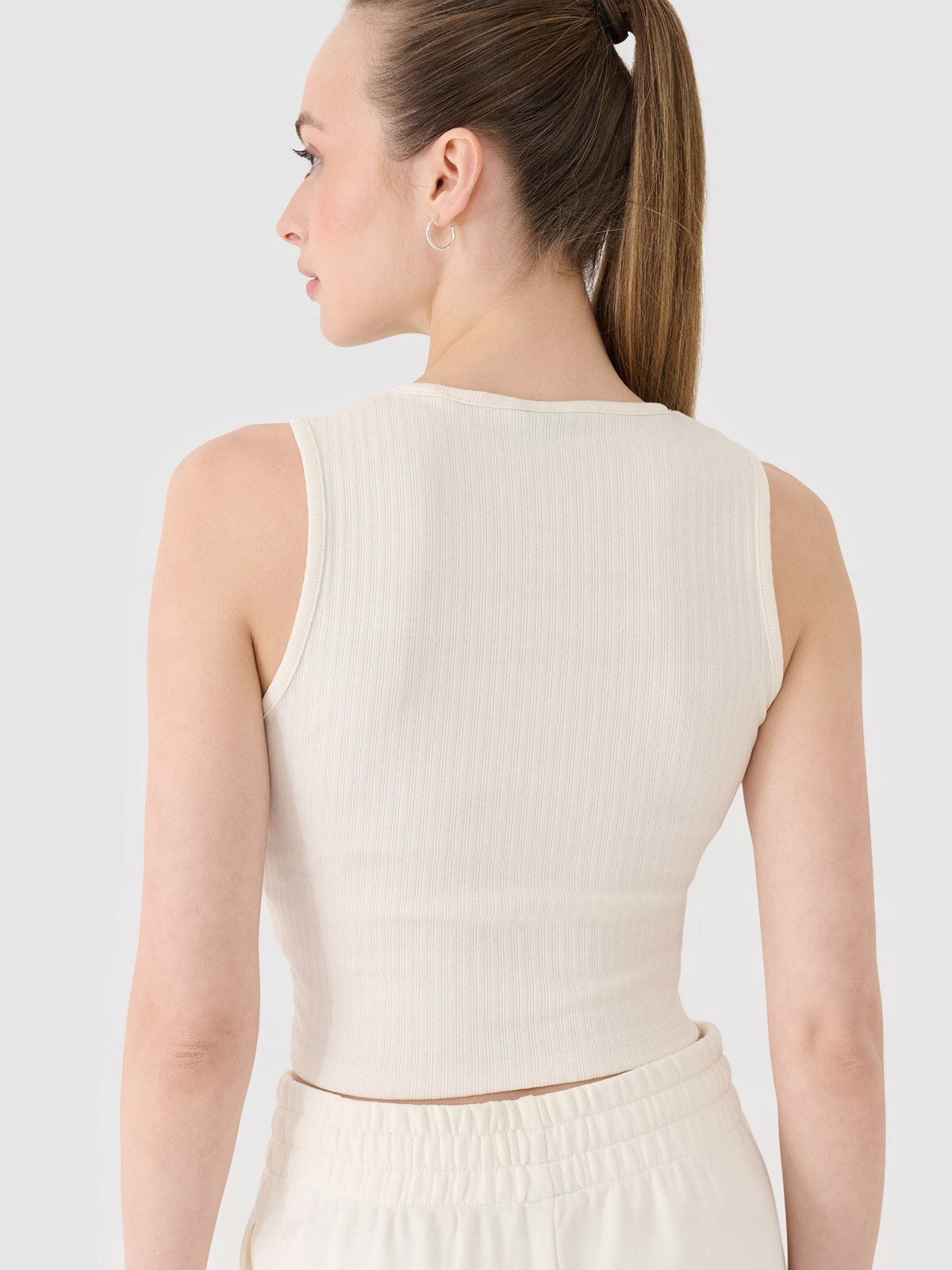 Posiada dopasowany krój slim, który przylega do ciała oraz skrócony fason typu cropped sięgający do linii talii. Dzianina posiada charakterystyczne, widoczne pionowe prążki. Jest rozciągliwa i miękka w dotyku.