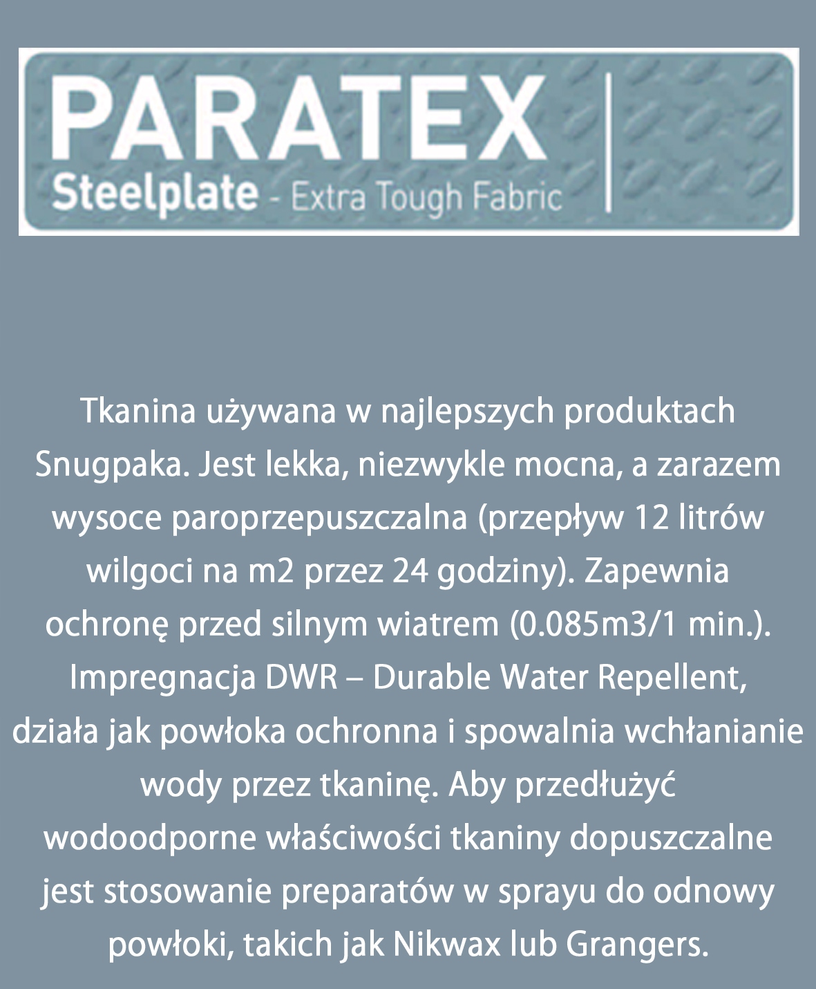 Śpiwór Special Forces System charakteryzuje wyjątkowe wypełnienie syntetyczne Softie Premier, stosowane w najlepszych produktach Snugpaka, które zapewnia ciepło nawet gdy śpiwór jest mokry. Natomiast zewnętrzna warstwa z niebywale mocnego materiału Paratex Steelplate (w wersji olive i czarnej) lub Paratex Micro (w wersji multicam).