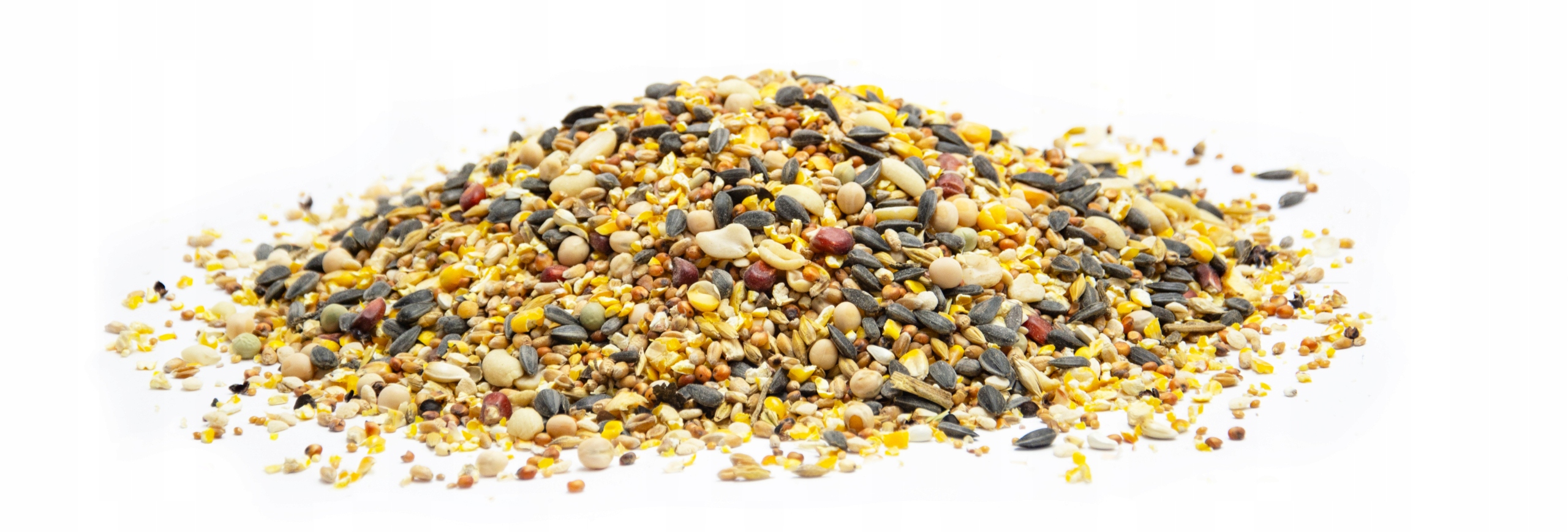 Тщательно отобранные зерна: желтая кукуруза и красный, сорго красный, просо золотое, Дари, Карди, гречиха, горох, зеленый горох, пшеница, ячмень, зерновой экструдат, черный подсолнечник, ореховый куб, льняное семя