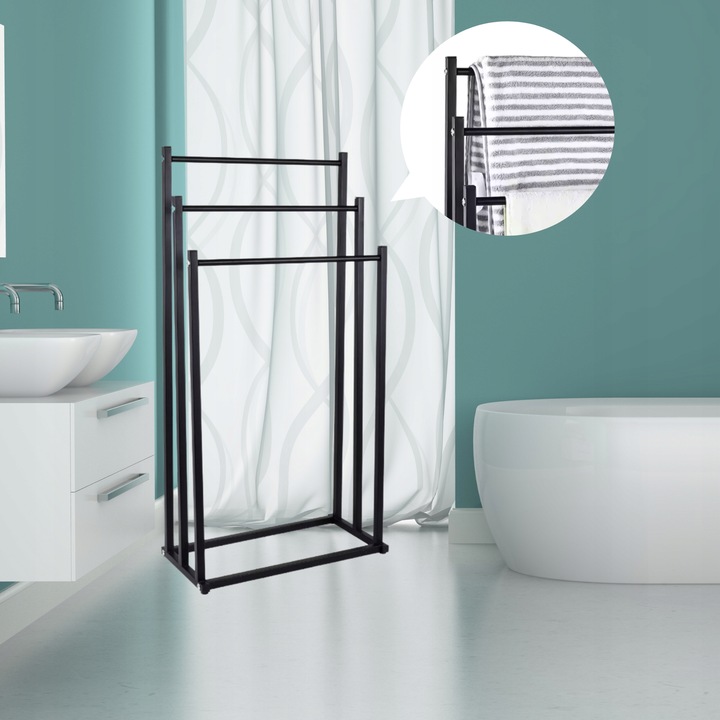 Отдельно стоящая вешалка для полотенец, это идеальное решение для вашей ванной комнаты. С тремя руками вы повесите на него больше полотенца, а также одежда. Вешалка покрыта прочной краской, так что вы будете он наслаждался им долгое время, не опасаясь повреждений. Вешалка легко чистить, и благодаря его элегантному внешнему виду вы поставите его не только в ванной комнате, но и на балконе, в гостиная или терраса!