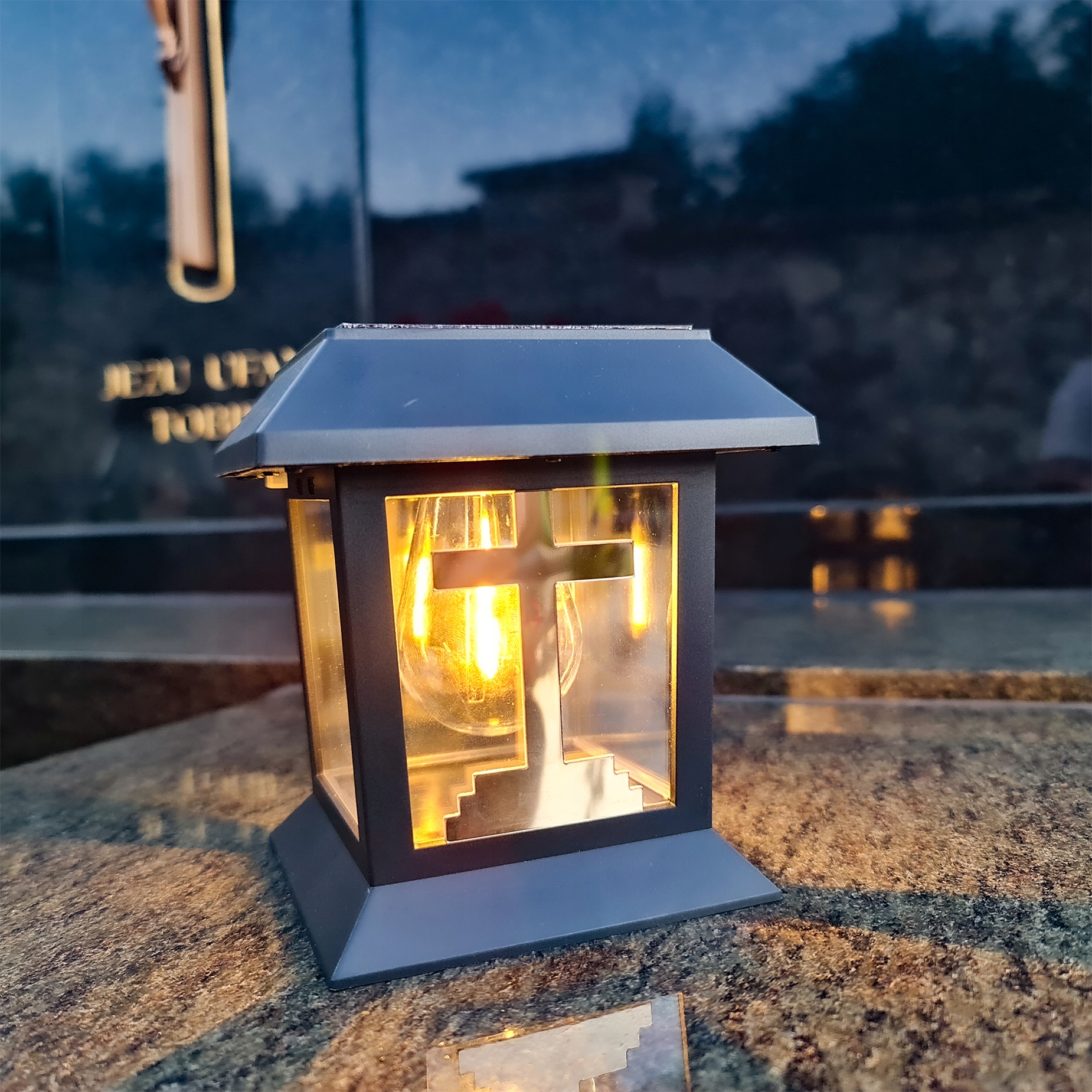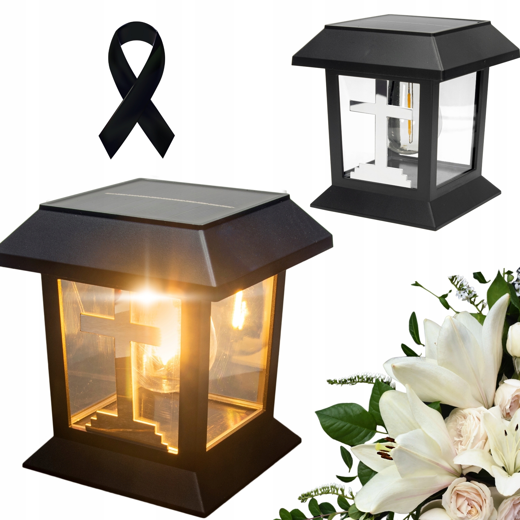 LAMPA SOLARNA ZNICZ NA GRÓB NOWOCZESNA INSPIROWANA KLASYKĄ ZE SREBRNYM KRZYŻEM