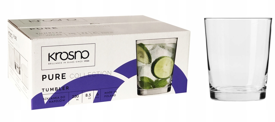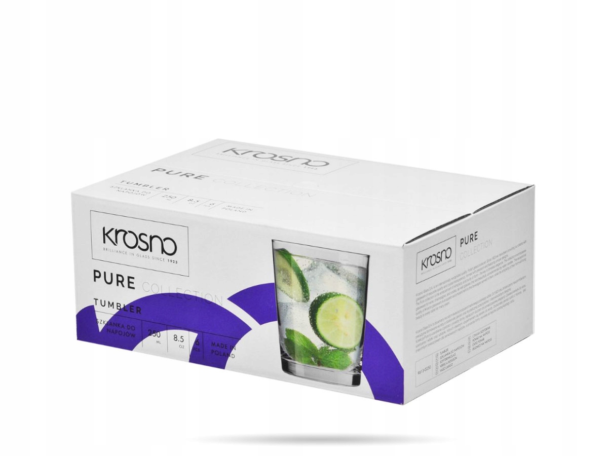Zestaw 6 niskich szklanek o pojemności 250 ml z serii Pure marki Krosno. Uniwersalne szklanki sprawdzą się do serwowania w nich soków, wody lub innych napojów.