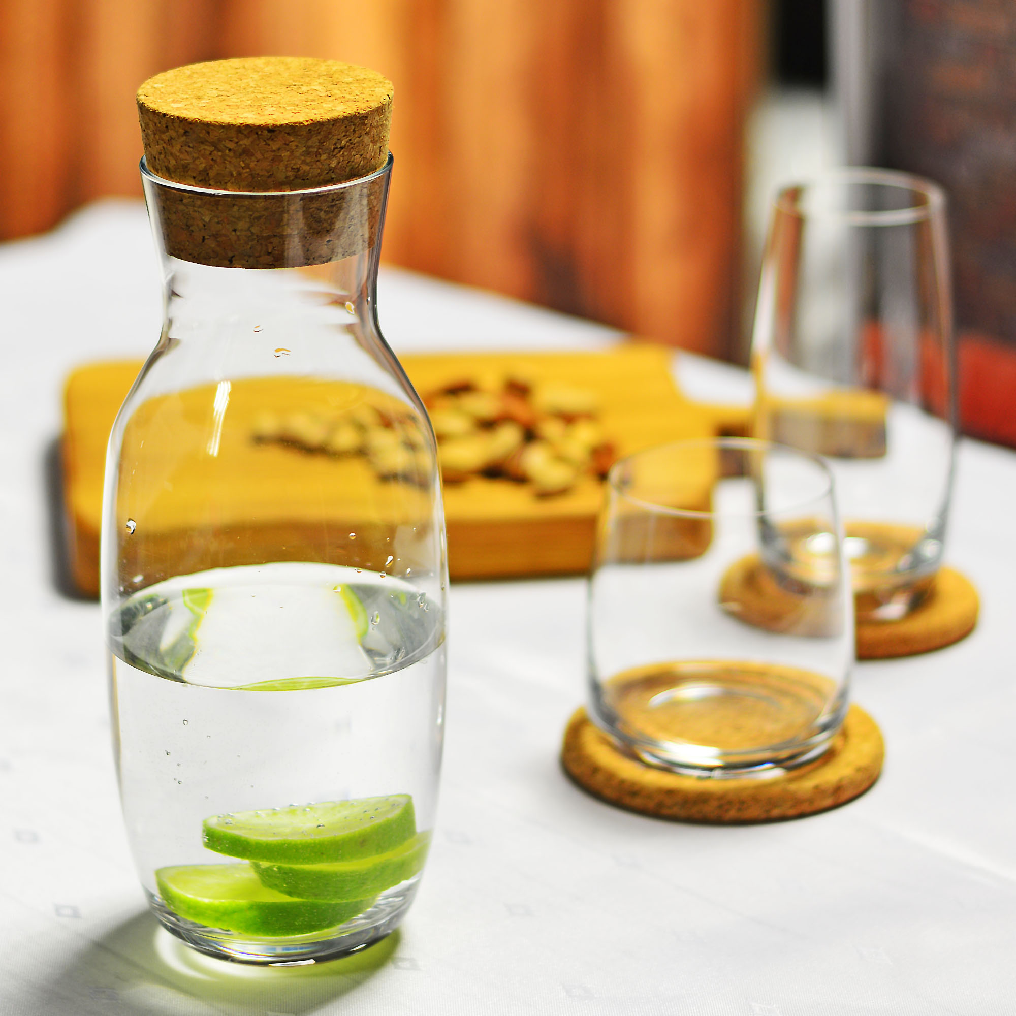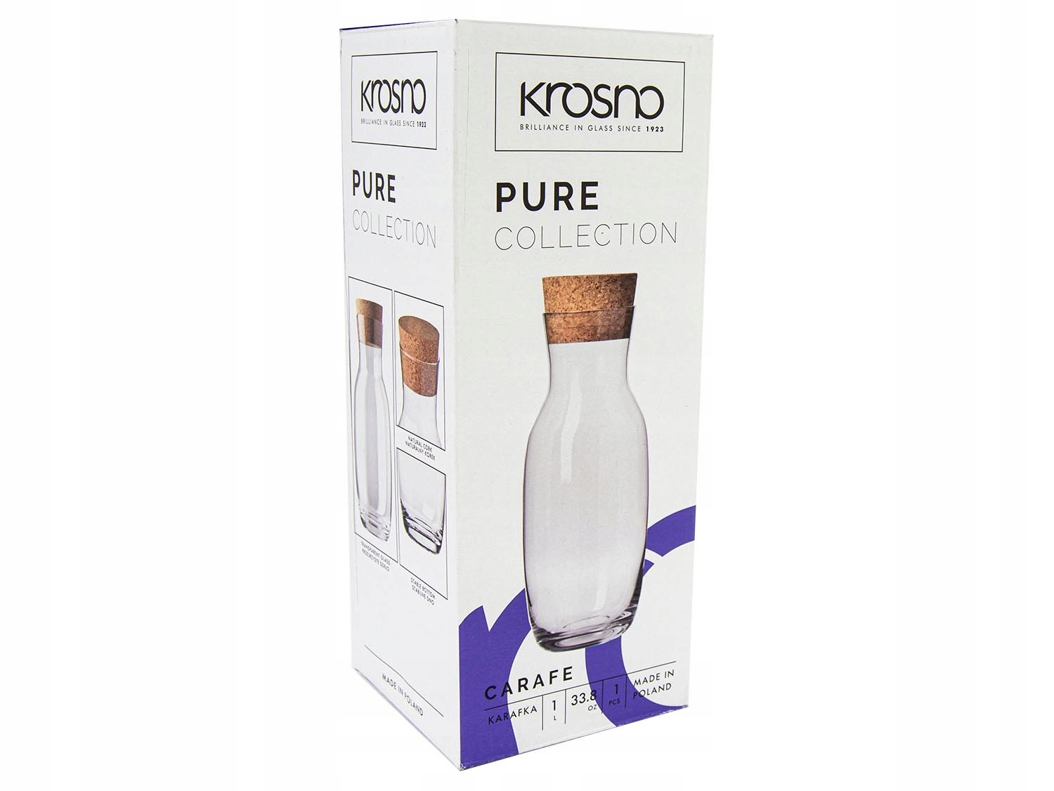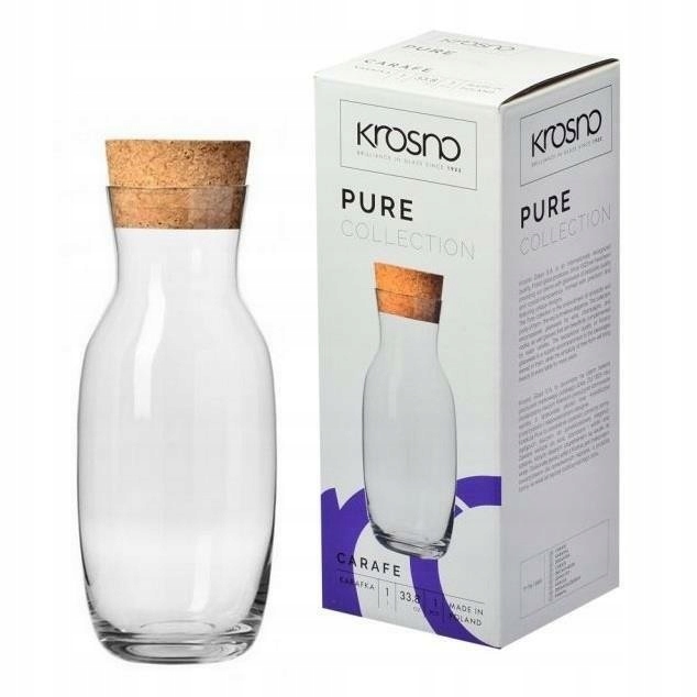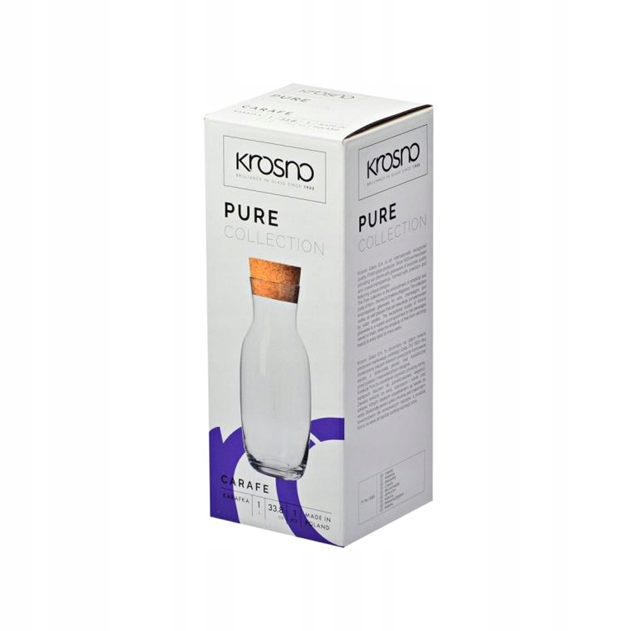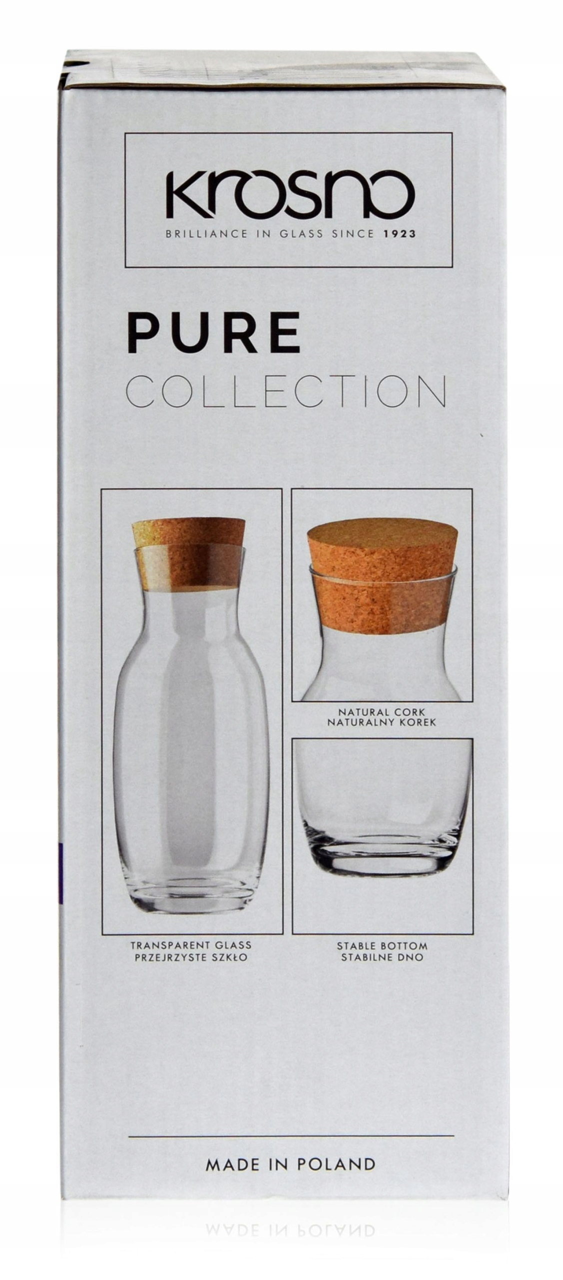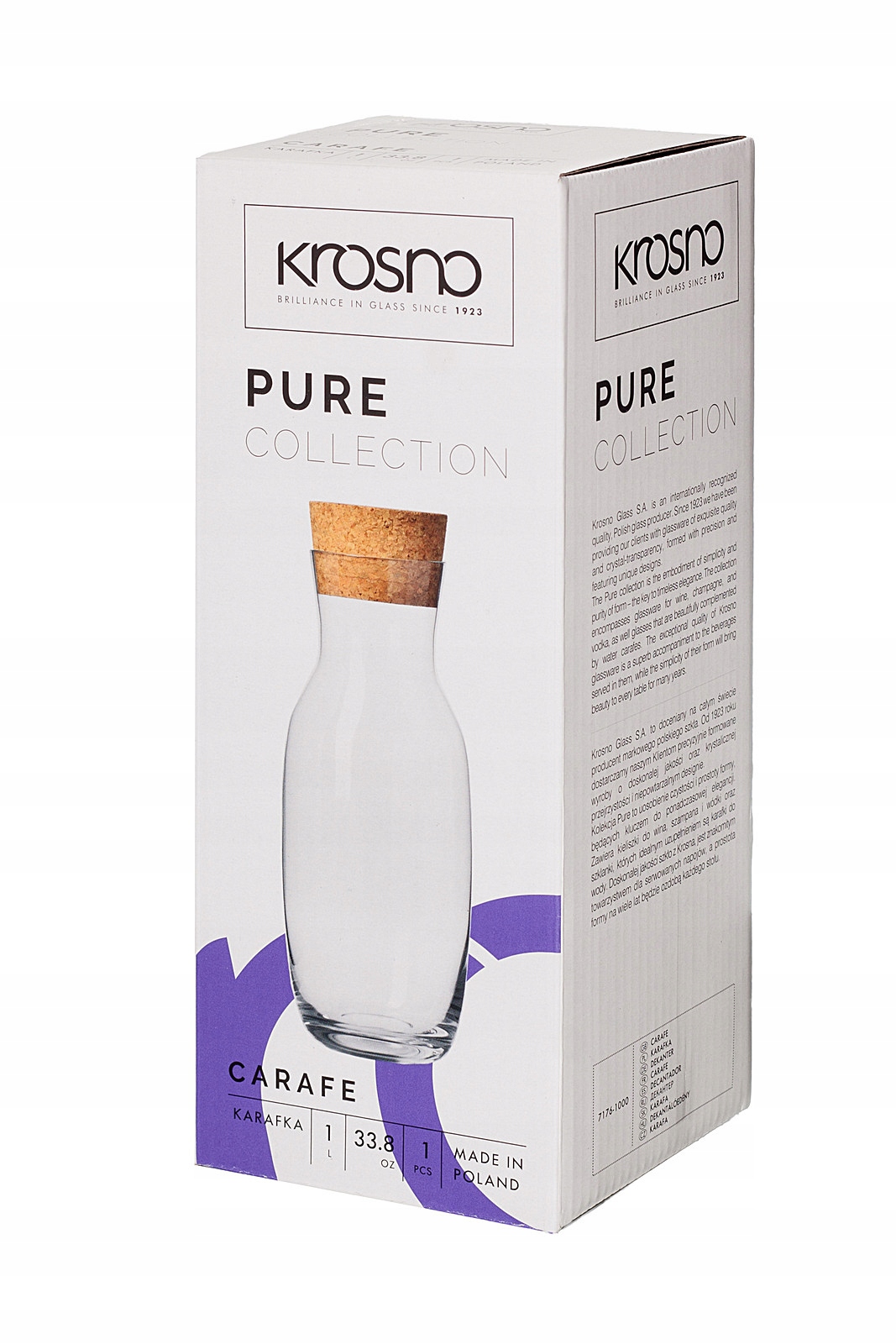 Szklana karafka o pojemności 1 litra z serii Pure firmy Krosno. Minimalistyczny design karafki, naturalny dodatek w postaci korka sprawia, że naczynie prezentuje się estetycznie i elegancko.