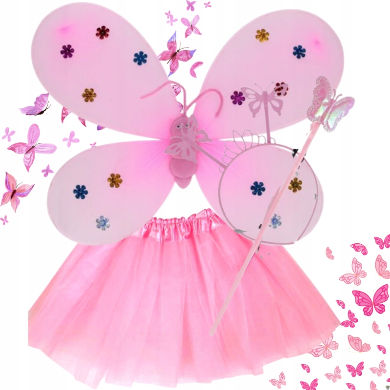 Przebranie składa się z tiulowej spódniczki tutu oraz spiczastych skrzydeł.