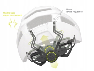 Zastosowana konstrukcja pozwala na precyzyjne przyleganie regulatora do głowy, jednocześnie zapewniając doskonały przepływ powietrza jak i pewne umiejscowienie kasku na głowie.
