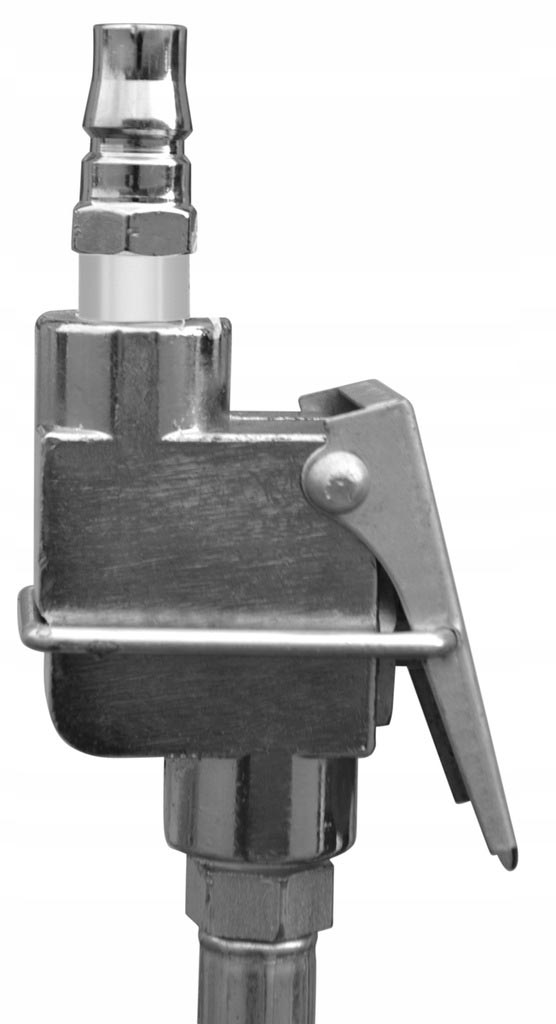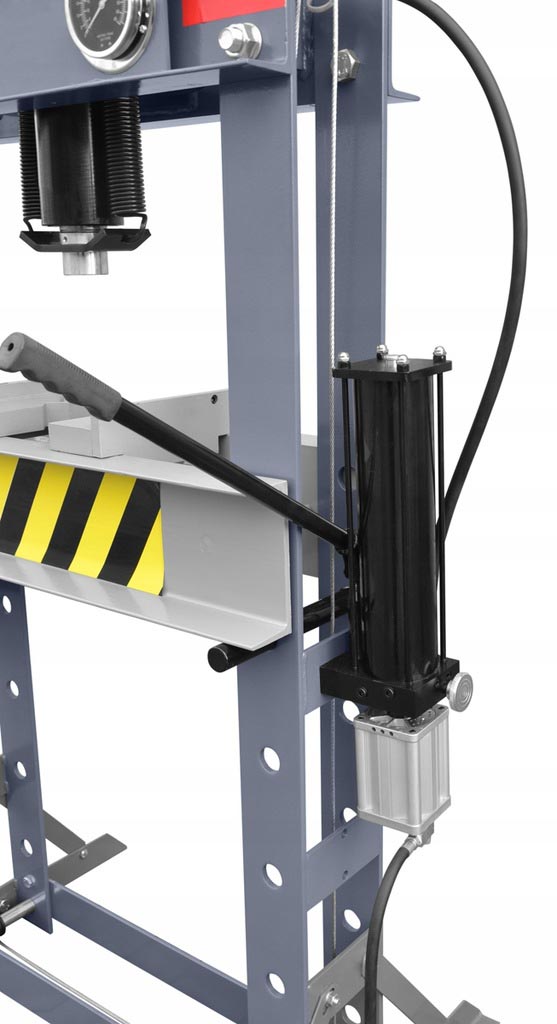 Pompa pneumatyczna umożliwia opuszczenie tłoka do powierzchni materiału natomiast pełną siłę nacisku widoczną na manometrze uzyskujemy za pośrednictwem dołączonej dźwigni obsługiwanej ręcznie. Cofnięcie tłoczyska następuje po odkręceniu śruby zaworu.