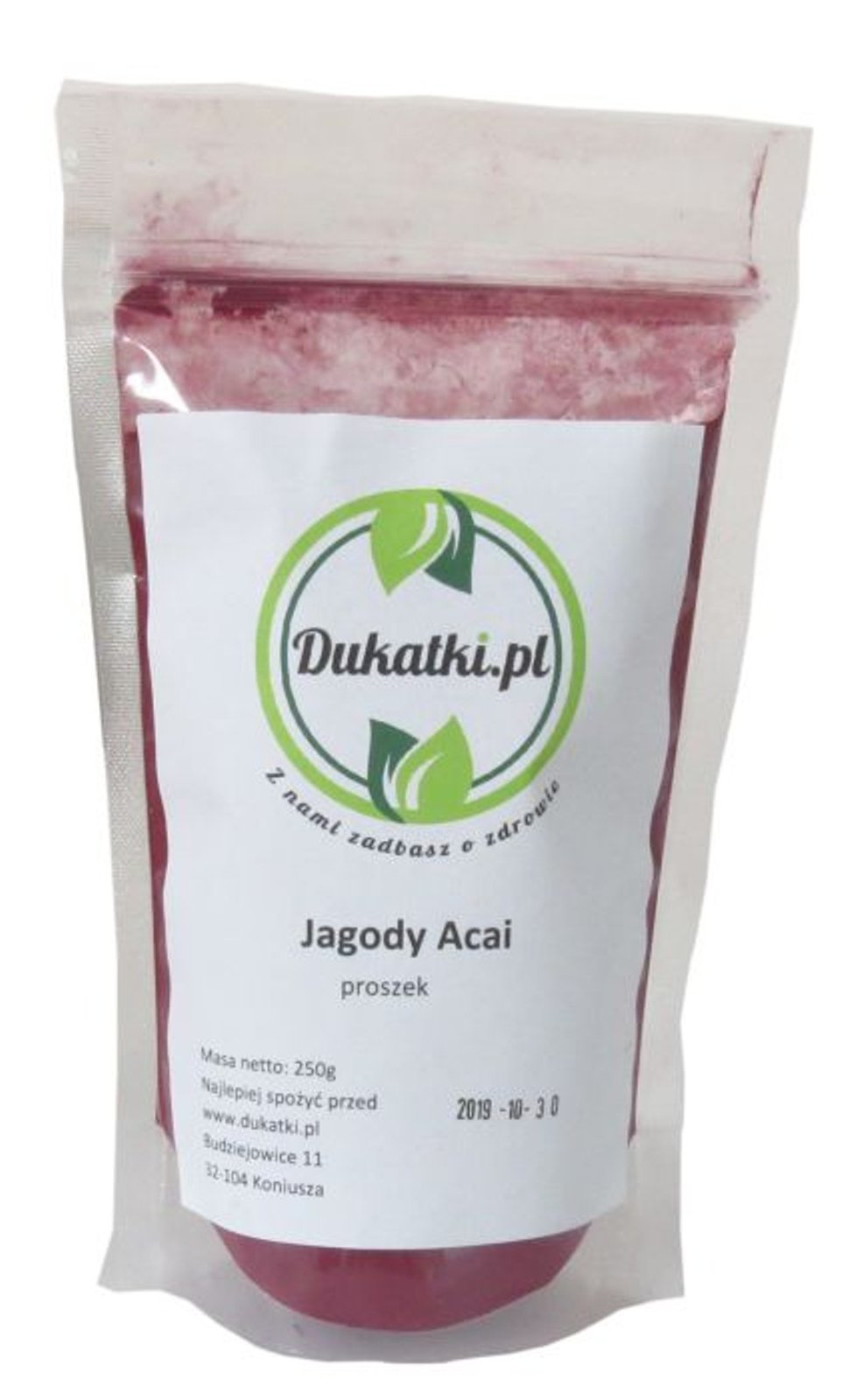 Jagoda palmy brazylijskiej stała się sławna dzięki badaniom doktora Alexsandra Schaussa który przeprowadził je w kierunku zdrowego odżywiania. Wyniki są zaskakujące jak wiele zalet posiadają dla organizmu człowieka, zaliczana jest jako superfood. Jagoda acai zawiera witaminy z B1, B2, B3, C, E, kwasy omega 6 i omega 9, beta-karoten, błonnik, żelazo, fosfor, wapń, potas. Jagody acai, proszek- wspomaga proces odchudzania regulując wagę ciała, podwyższa odporność, spowalnia proces starzenia, wspomaga profilaktykę chorób serca, poprawiają kondycję umysłową, oczyszczają organizm, poprawiają wzrok, obniżają ciśnienie krwi, regulują poziom cukru, zwalczają wolne rodniki, pomagają utrzymać dobrą kondycję fizyczną oraz poprawiają samopoczucie. Polecane dla wszystkich którzy dbają o ładny wygląd i dobre samopoczucie.
