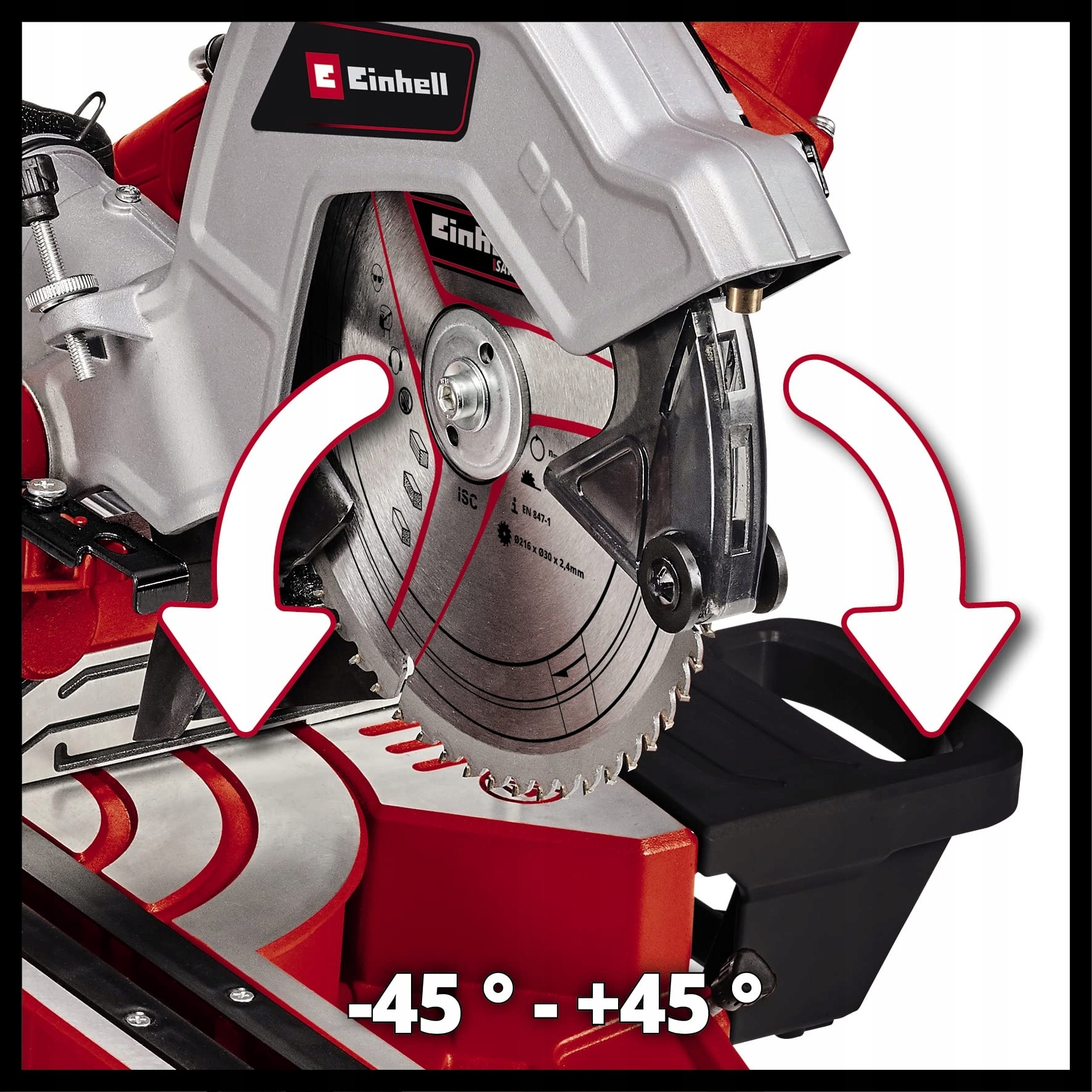 Головка пилы может быть наклонена с обеих сторон для наклонной резки и блокировки шпинделя и хорошо доступный винт пильного диска позволяет легко заменить пильный диск. Доступное всасывающее соединение имеет диаметр 36 мм, и в качестве альтернативы вы можете использовать прилагаемый мешок для пыли. Einhell Торцовочная пила с Лазерная и угловая регулировка-это прочная и эффективная машина, которая облегчит столярные работы и удовлетворительно.