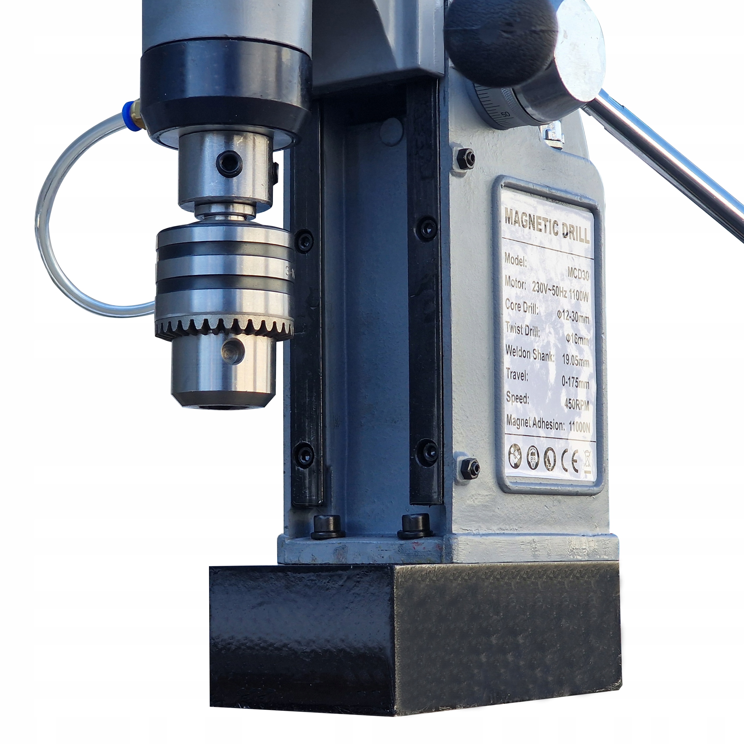 Dwucewkowy elektromagnes wysokiej mocy umożliwia bezpieczną pracę w każdej pozycji, nawet powyżej głowy. Został on ponadto wyposażony oddzielny włącznik zestawiony z bezpiecznikiem, co czyni wiertarkę mniej awaryjną i bardziej bezpieczną.