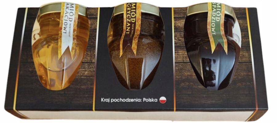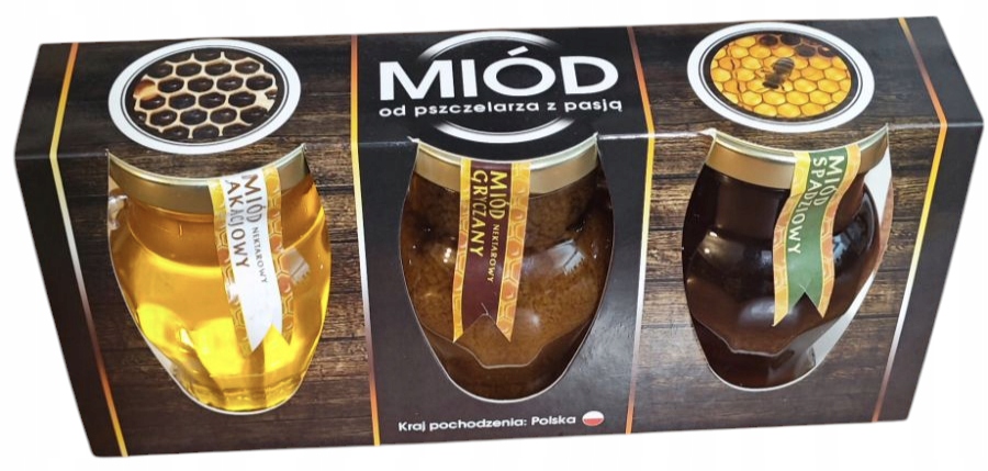 Zestaw trzech miodów w ozdobnych szklanych amforkach (spadziowy, gryczany, akacjowy) 3x140g.
