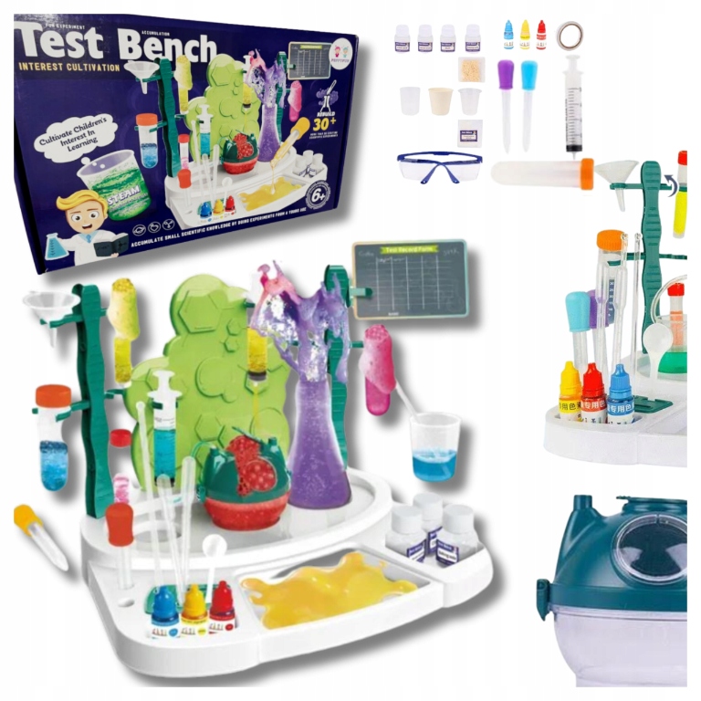 W skład zestawu wchodzą m.in. kolby, probówki oraz bezpieczne strzykawki do precyzyjnego dozowania cieczy. Zestaw zawiera również tabliczkę do zapisywania wyników i obserwacji, co rozwija analityczne myślenie młodych naukowców. Wielokolorowe substancje oraz akcesoria tworzą fascynującą atmosferę prawdziwego laboratorium, pozwalając na godzinne eksperymentowanie.