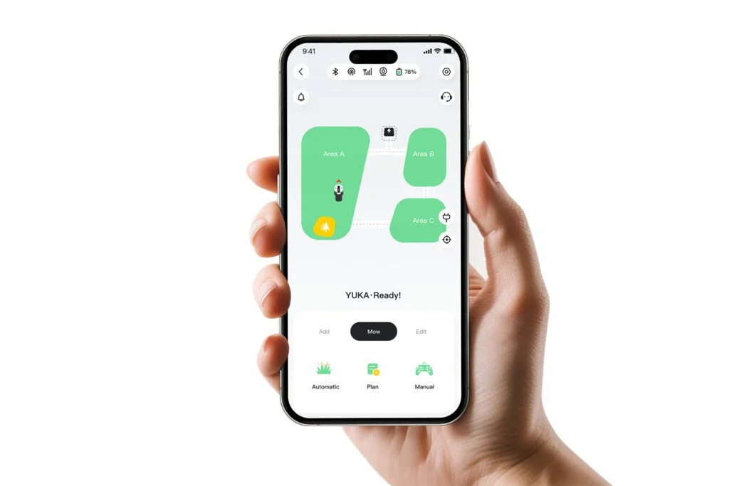 Нет необходимости в проводах приграничных, Юка мгновенно отображает всю территорию, предназначенную для кошения, создавая виртуальную границы всего за 8 минут. Все это благодаря использованию передовых технологий 3D-зрения усовершенствованная двойная система RTK.