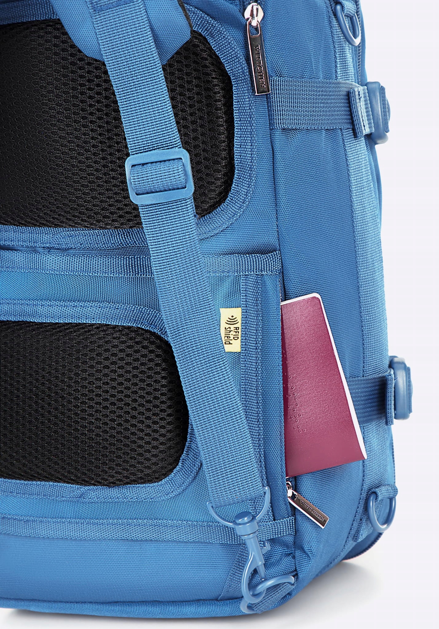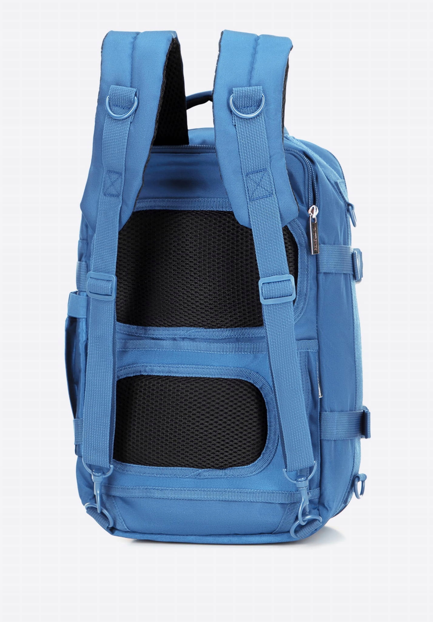 Wielofunkcyjna konstrukcja umożliwia noszenie plecaka zarówno na plecach, jak i w formie torby podróżnej. Regulowane, chowane szelki i odpinany pasek na ramię pozwalają dostosować sposób noszenia do indywidualnych potrzeb. Boczne pasy kompresyjne pomagają dopasować pojemność bagażu, a gumowane wyjście na kabel USB i słuchawki pozwala ładować urządzenia w trakcie podróży.