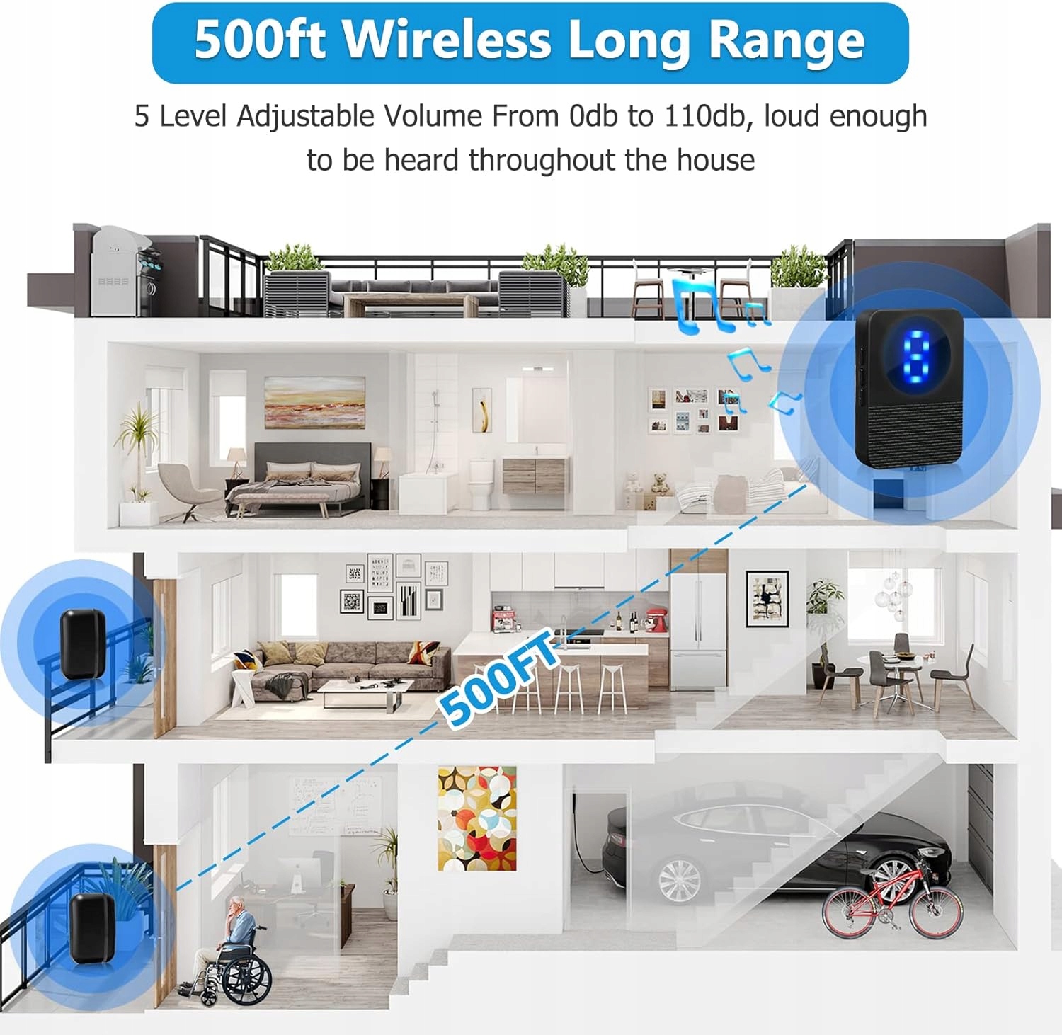 Duży zasięg (do 150 metrów) pozwala wiedzieć np. o przybyciu osoby, gdy jest się w innym pomieszczeniu lub nawet na innym piętrze, czy o przybyciu klienta. Można zastosować nawet w piwnicy/garażu i innych trudno dostępnych miejscach, jako swoisty alarm, a dzwonek do drzwi sprawi, że natychmiast zauważysz, że ktoś wszedł.