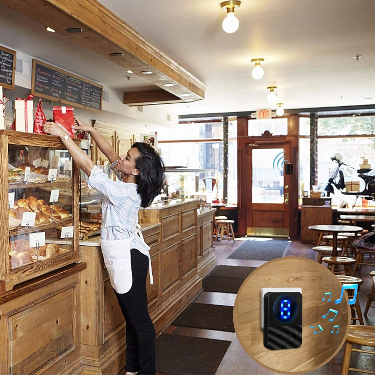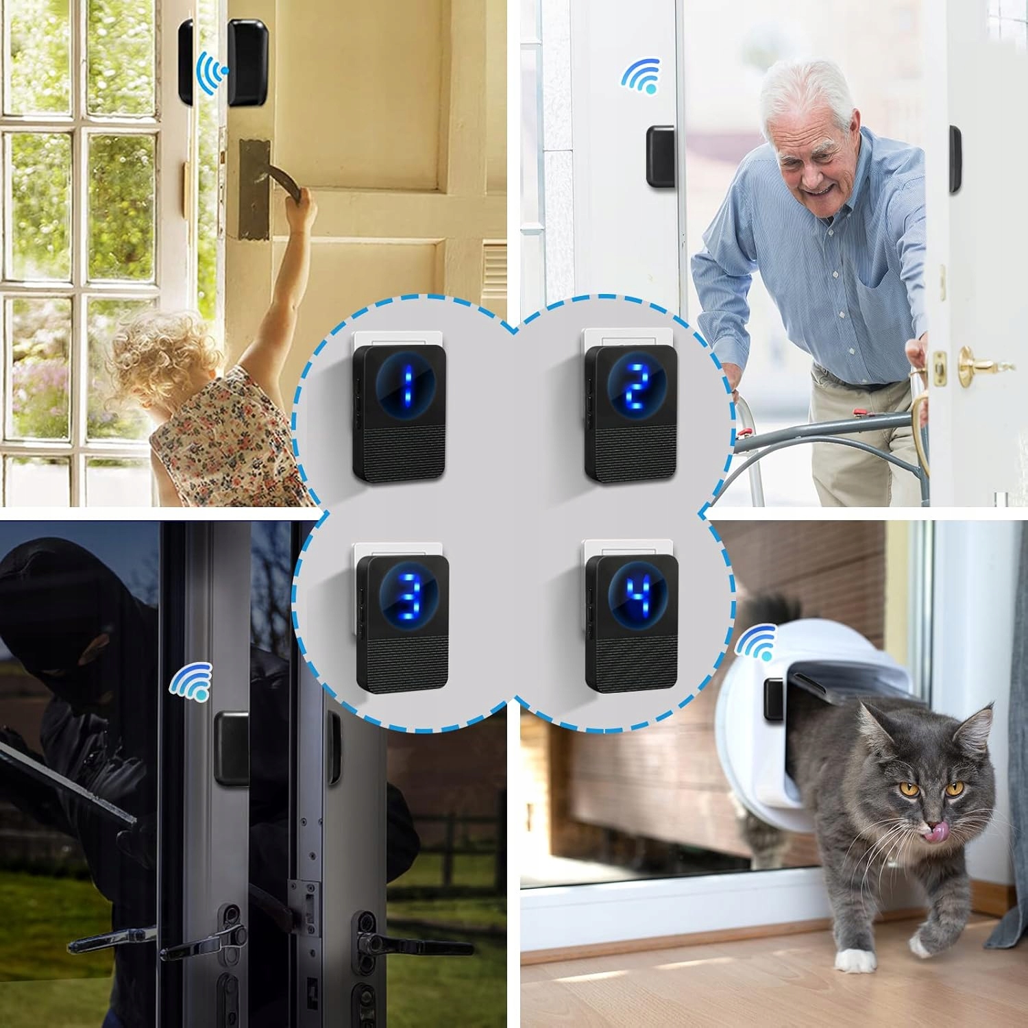 Bezprzewodowy dzwonek do drzwi pomaga zaoszczędzić kłopotów z instalacją przewodów. Wystarczy podłączyć odbiornik, przykleić bezprzewodowy czujnik do wybranych drzwi/okna, może także to być szuflada, szafka czy drzwi od lodówki i ustawić różne dźwięki dzwonka, aby wiedzieć, które drzwi są otwarte przy wejściu.