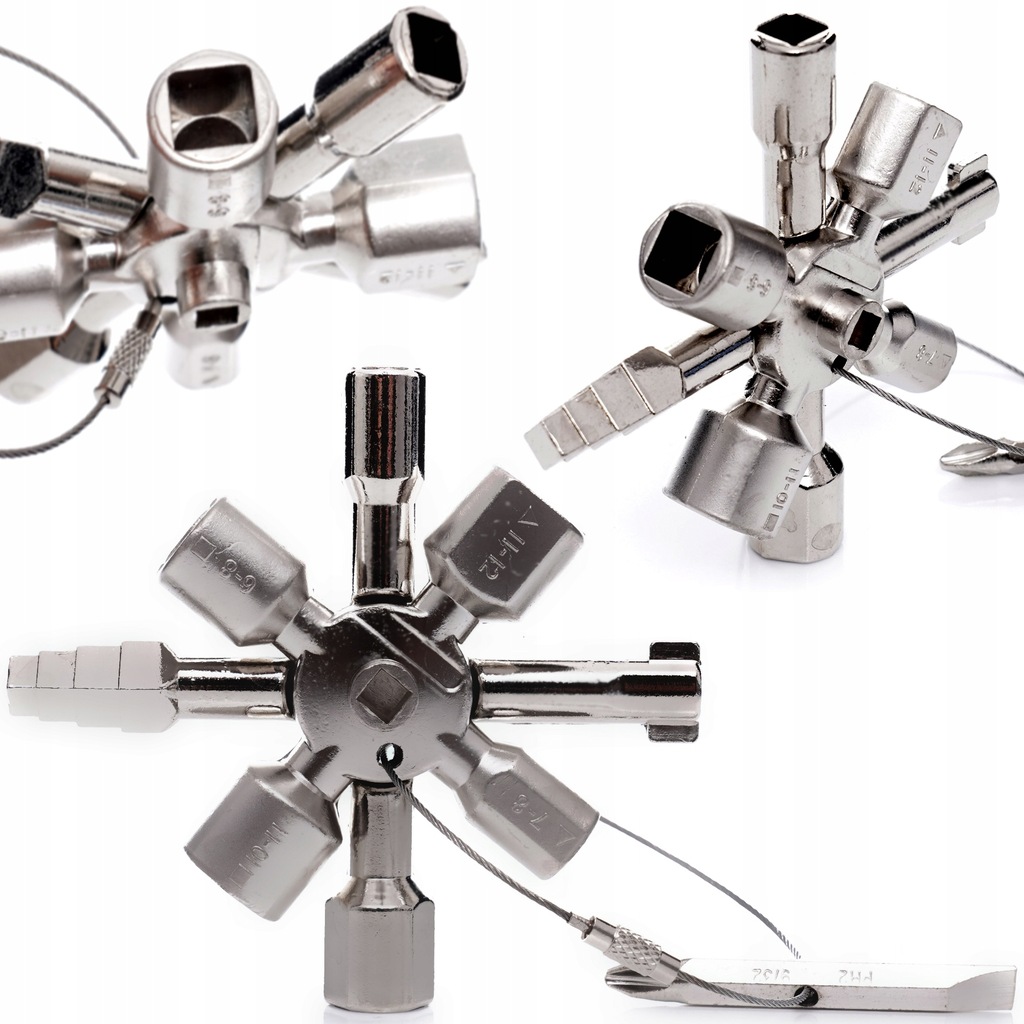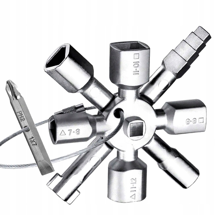 Универсальный ключ 10в1 для закрытия шкафов управления, электрических, газовых, радиаторов и т. д. изготовлен из цинкового литья под давлением. В комплекте бит на тросе.